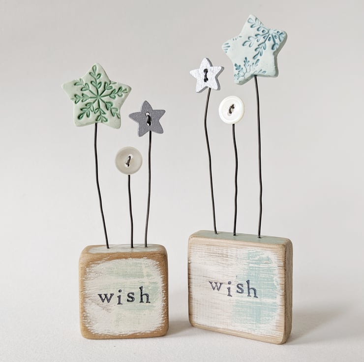 A clay star stands on a wire stalk in a painted wooden block.