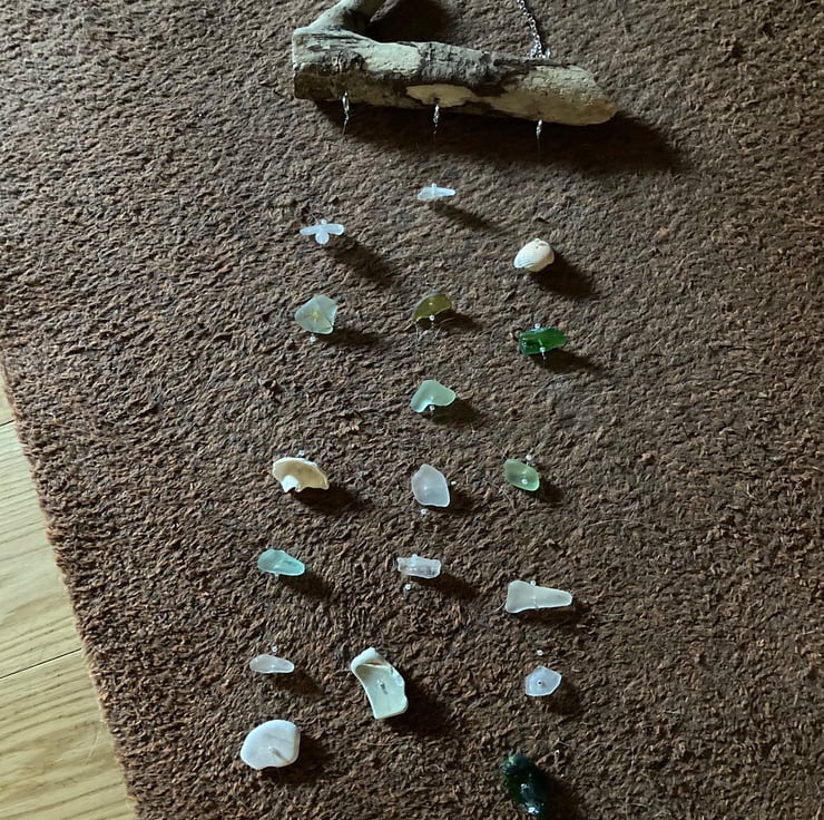 Seaglass that is not suitable to use in jewellery makes lovely suncatchers. Using driftwood and unwanted fishing line makes this a lovely up-cycled addition to a garden or as an interior window decoration, catching the light.