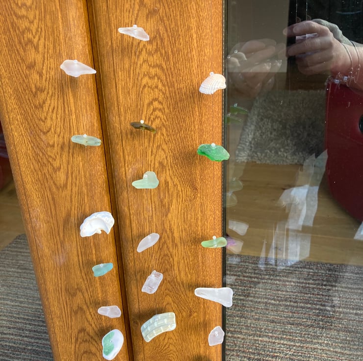 The glass, shells and sea pottery are attached to unused nylon fishing line and attached to the wood with screw-in eyelets. These are also used to attach the hanging chain.