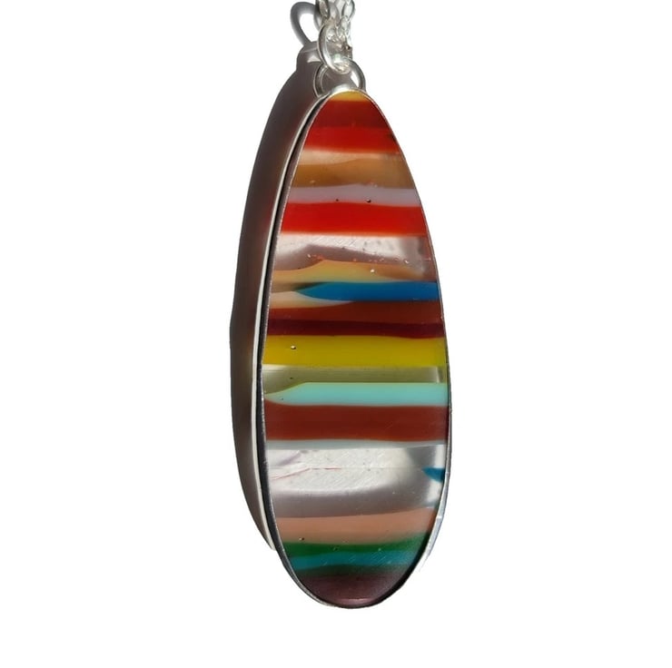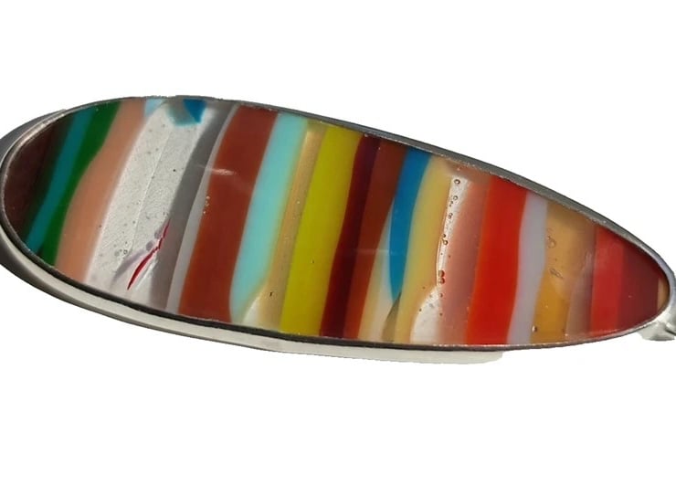 Made from years and years of build-up, this paint has now hardened sufficiently to be cut and polished. Lapidarists slice them up into pieces and shape them so that all the layers of colour can be seen. Jewellery makers then buy these smaller pieces to incorporate them into one-off pieces of jewellery for you!