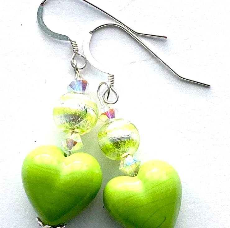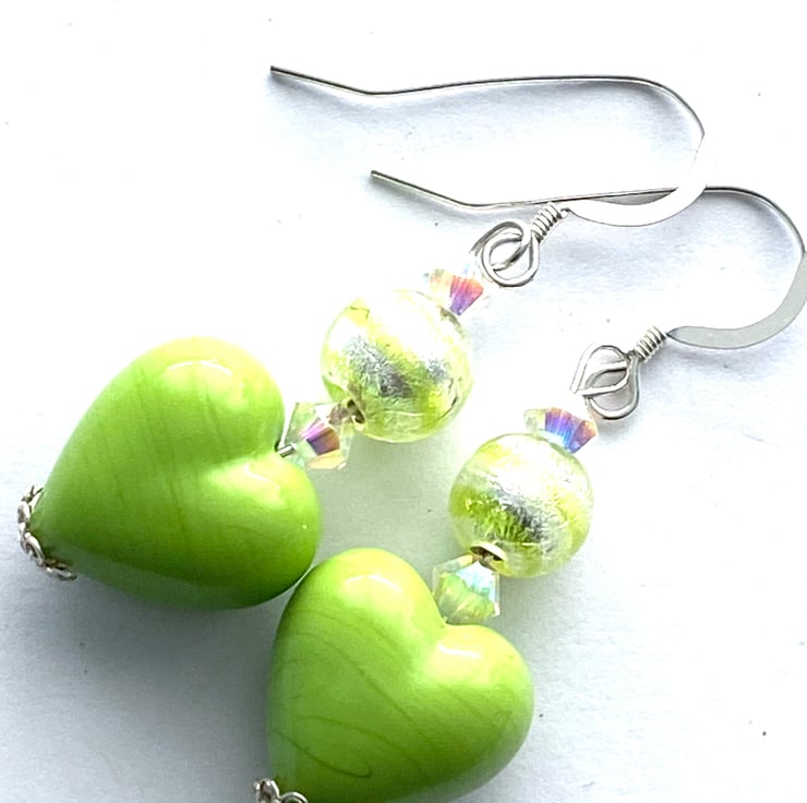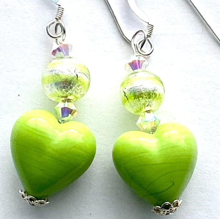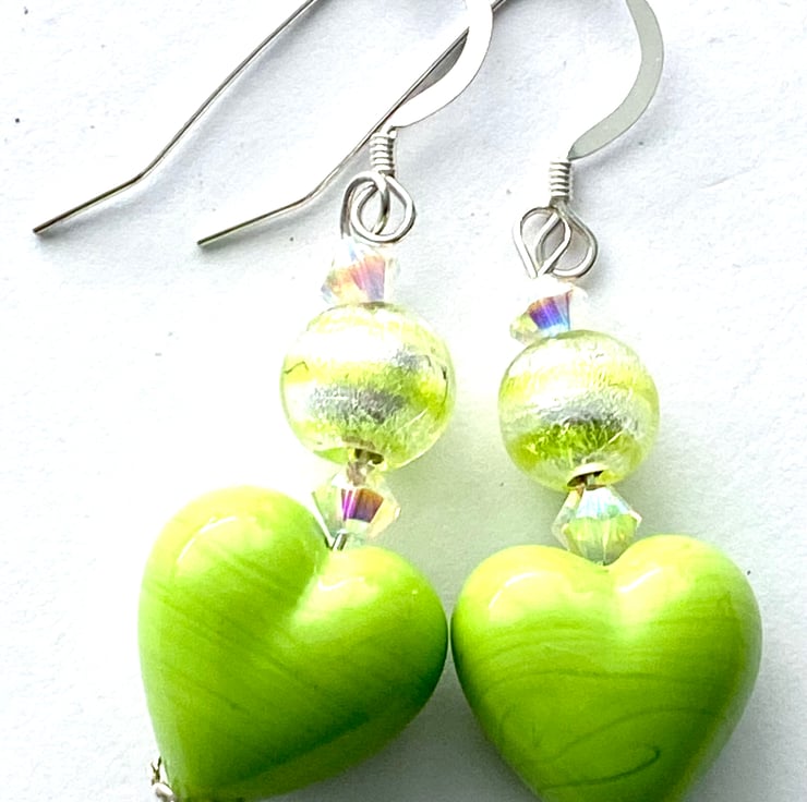 Gorgeous Murano glass heart earrings with opaque lime green Murano glass hearts (14mm) and pure silver foiled silver Murano glass round beads with lime markings and glittering Swarovski crystal beads. The earrings hang from sterling silver ear wires and measure 30mm in length excluding wires.They are presented in a pretty gift bag.