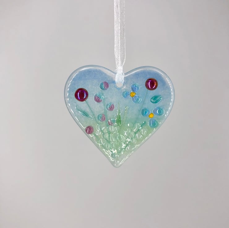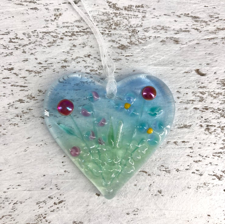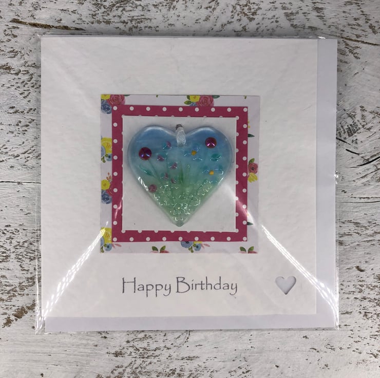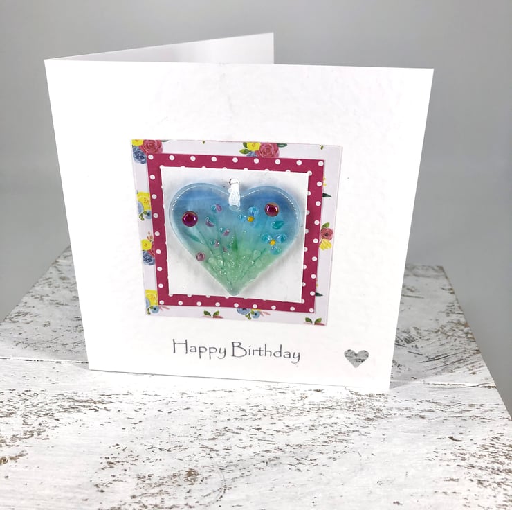 A lovely handmade card with a gorgeous glass heart with pink & turquoise meadow flowers attached to it - the perfect card and gift in one!
