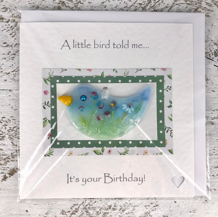 A lovely handmade card with a gorgeous little glass bird with pretty meadow flowers and a little daisy attached to it - the perfect card and gift in one!