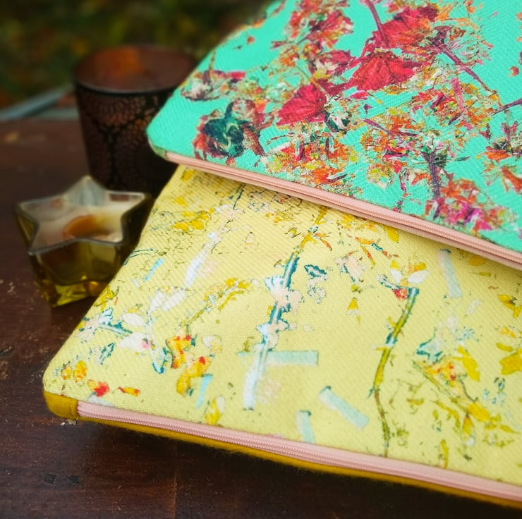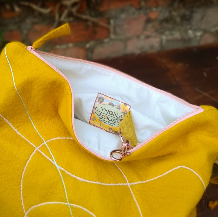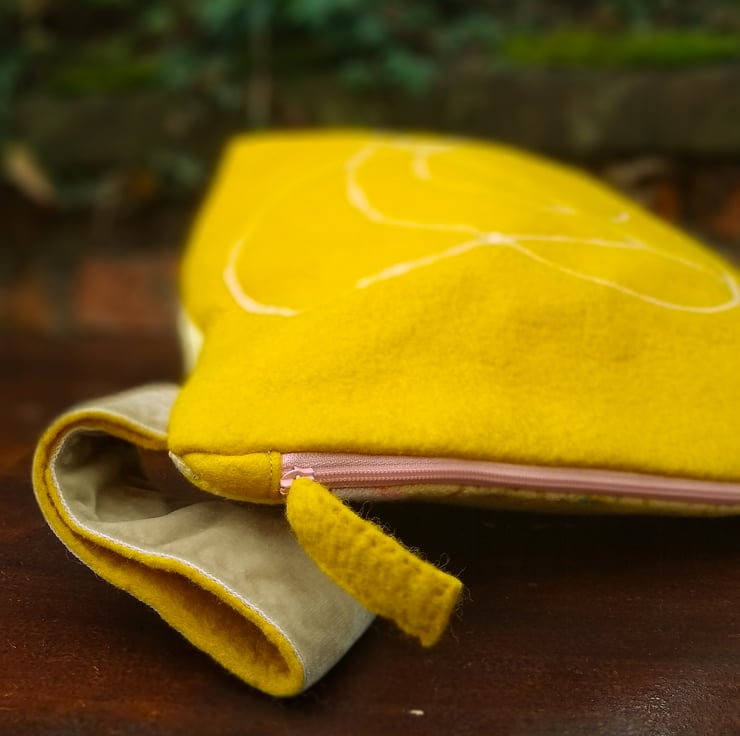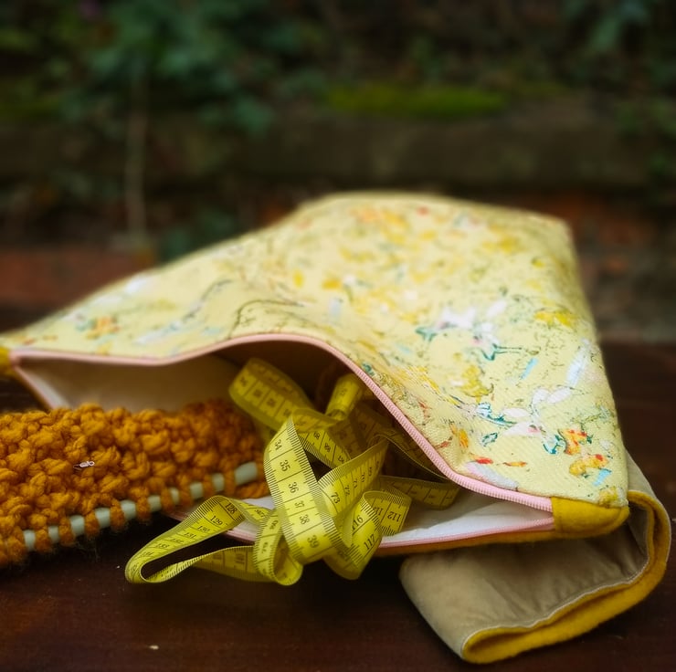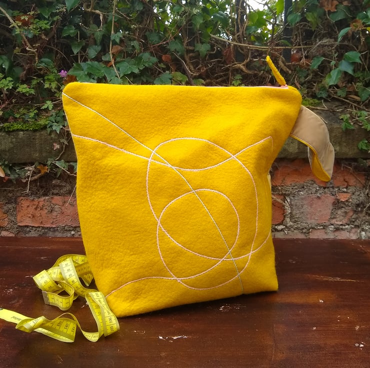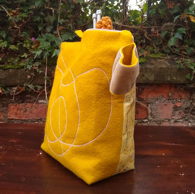 A roomy project bag, featuring my original Sprigs pattern, printed onto herringbone tweed by a company in the UK. Backed in a vibrant mustard wool mix felt, lined in washed calico and firm interfacing, and finished with a felt lined velvet strap and swivel clip, it would make a decorative and practical gift for any maker.