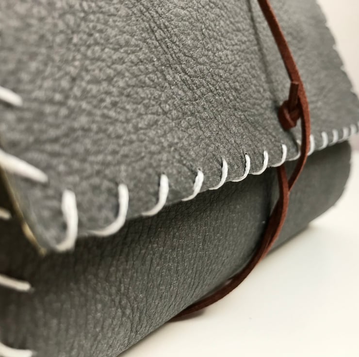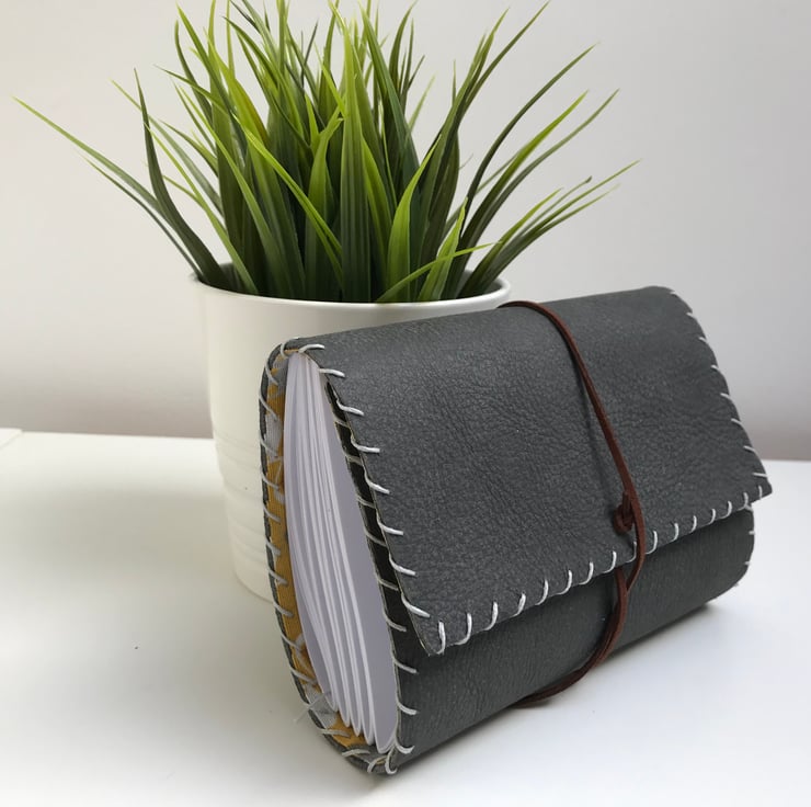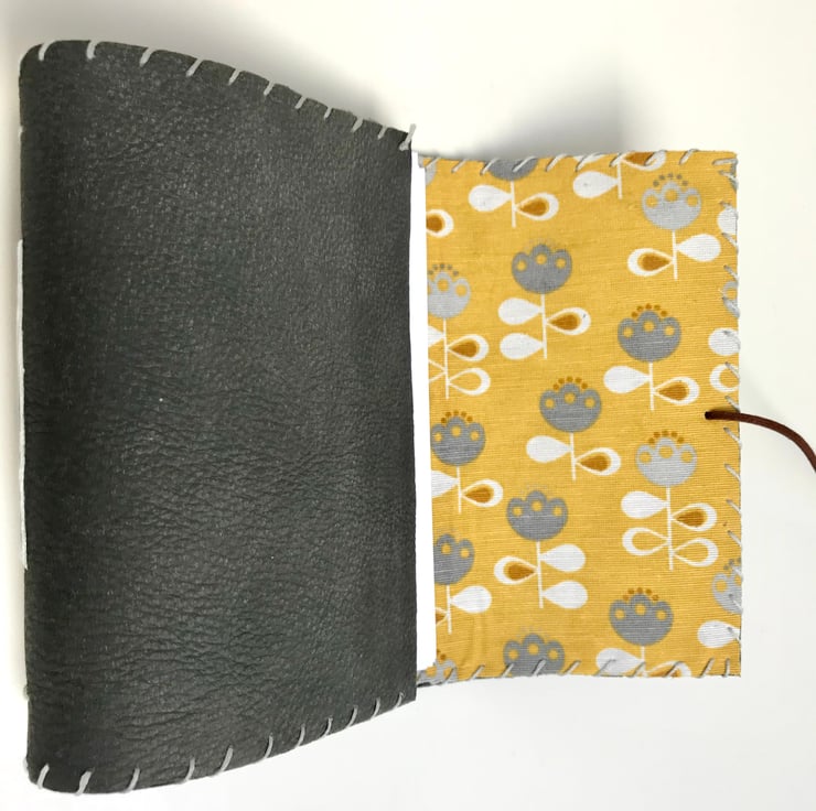 A gorgeous brushed grey leather with a gorgeous yellow, grey and white tulip fabric lining. The notebook is hand stitched around the edge with a silver coloured thread and contains 200 blank sheets of plain paper which are then hand stitched to the leather in 5 signatures. The notebook is fastened with a dark brown suede cord tied loosely at the front.