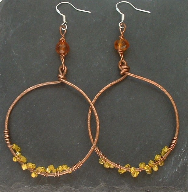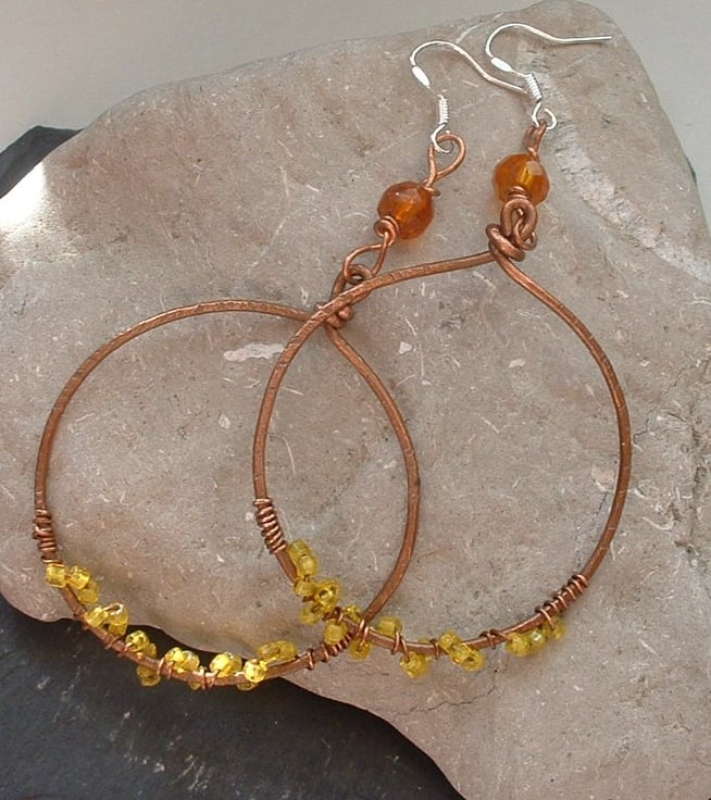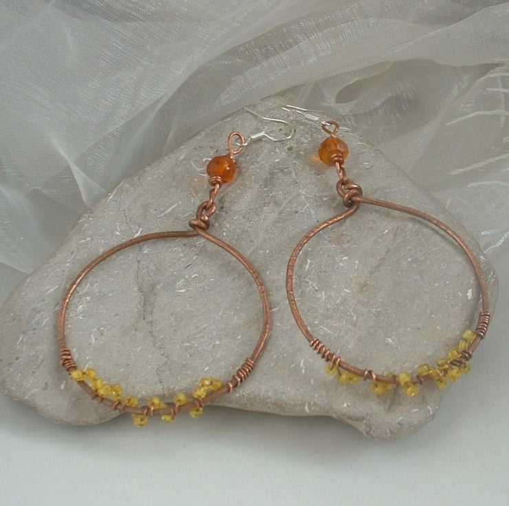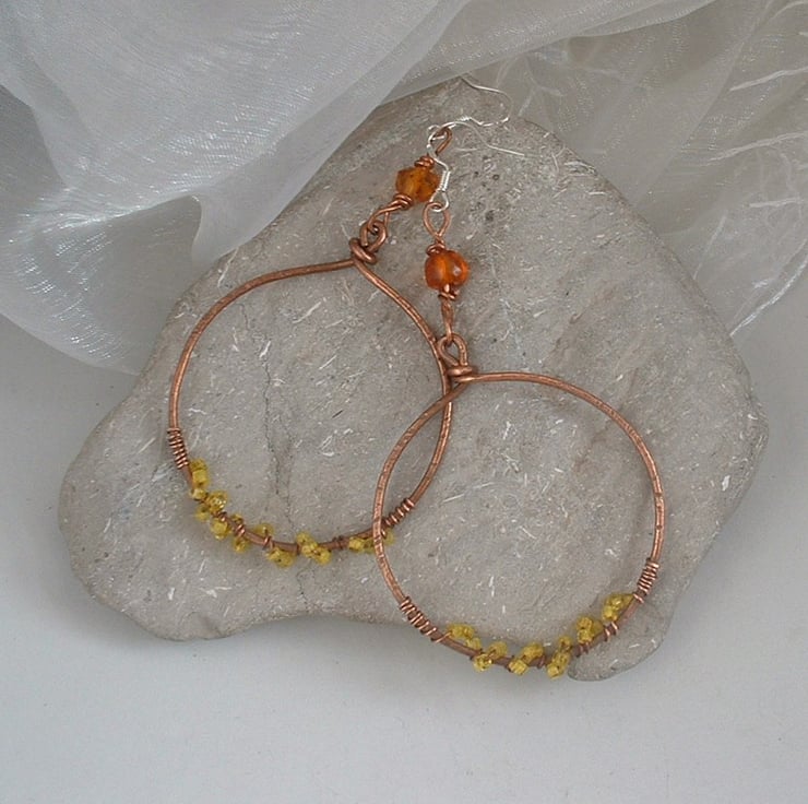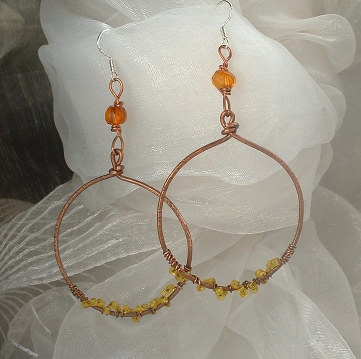 They were made from copper wire, textured and shaped into hoops and wire wrapped with yellow seed beads, they have faceted amber beads to add yet more sparkle and sterling silver ear wires.