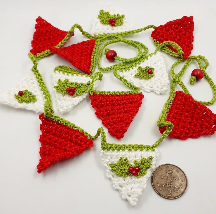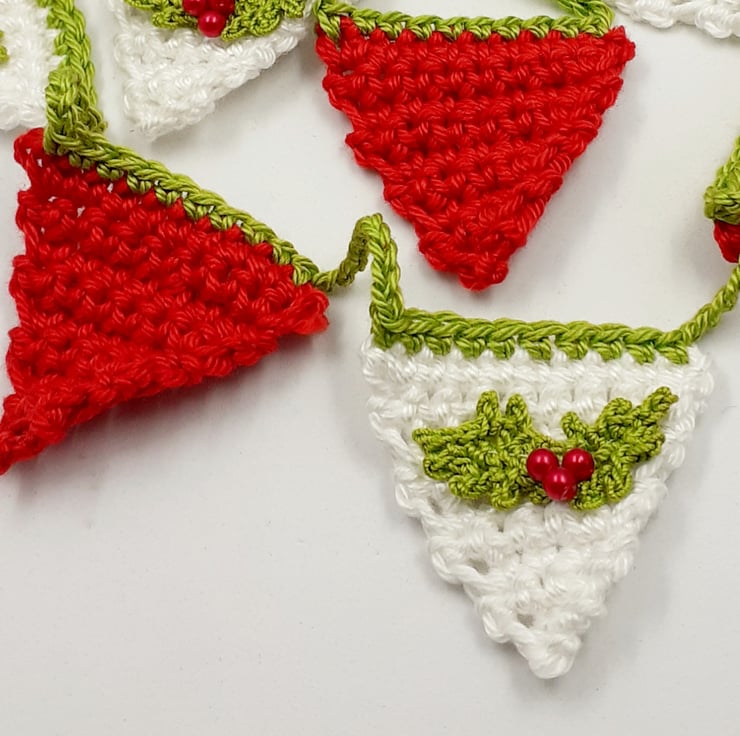 This pretty garland is crocheted in cotton. The white flags are embellished with tiny springs of crocheted holly which are hand-stitched to the bunting and have faux pearl berries.