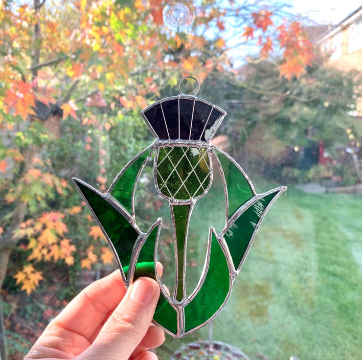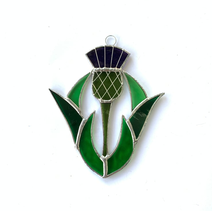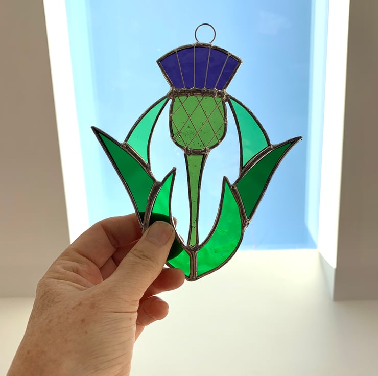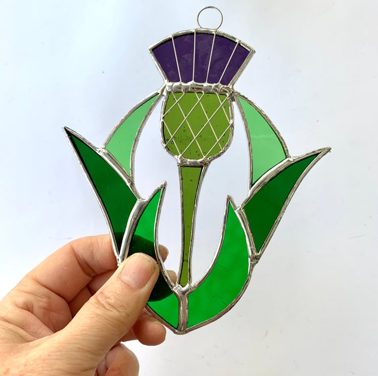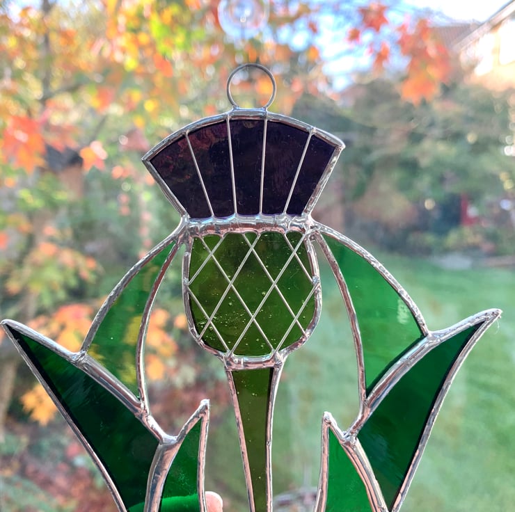 This has been made from 4 types of green stained glass for the leaves and stem and purple sea glass for the flower head. Tinned copper wire has been used to add detail to the flower.