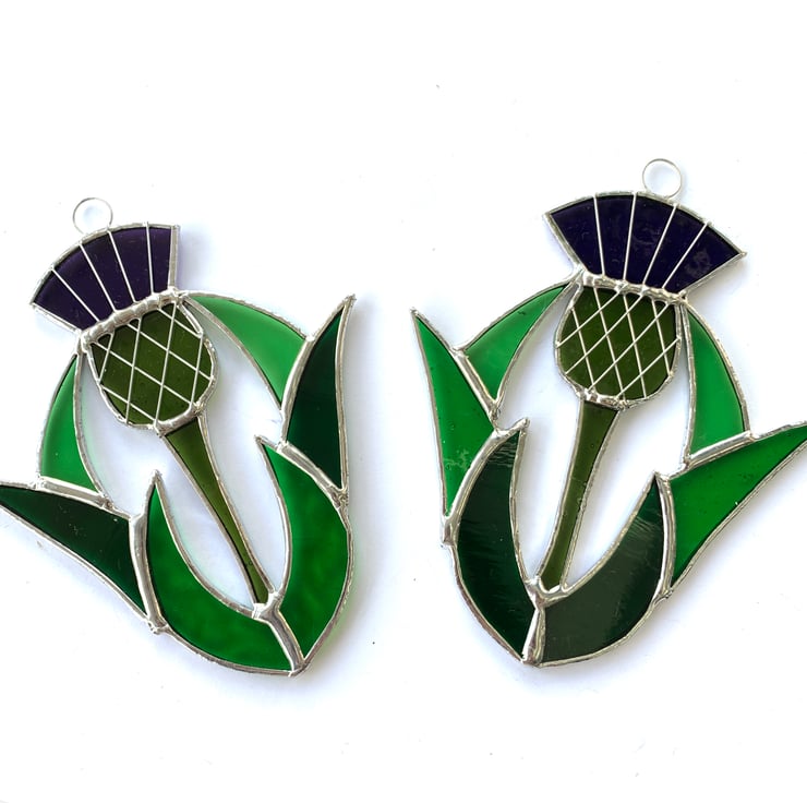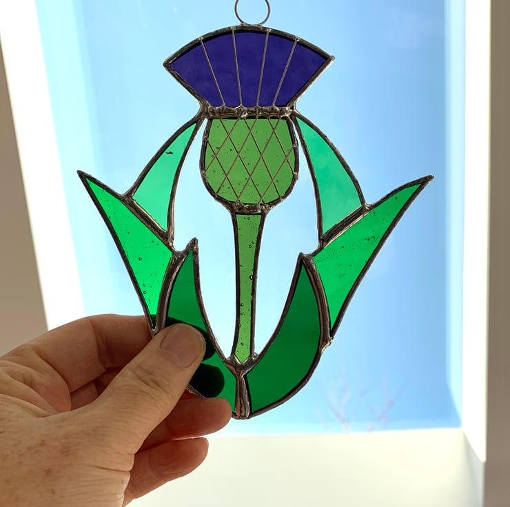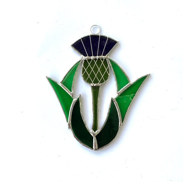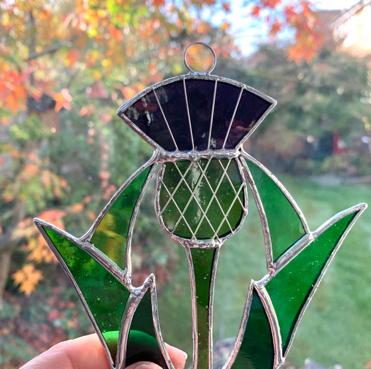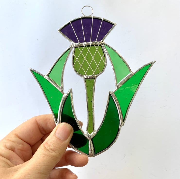This has been made from 4 types of green stained glass for the leaves and stem and purple sea glass for the flower head. Tinned copper wire has been used to add detail to the flower.