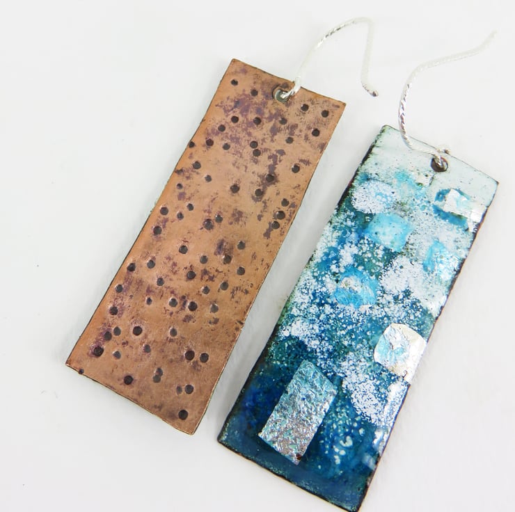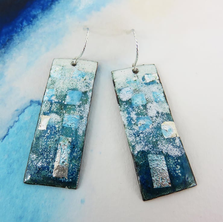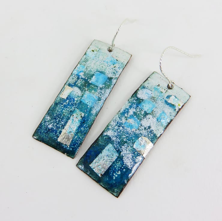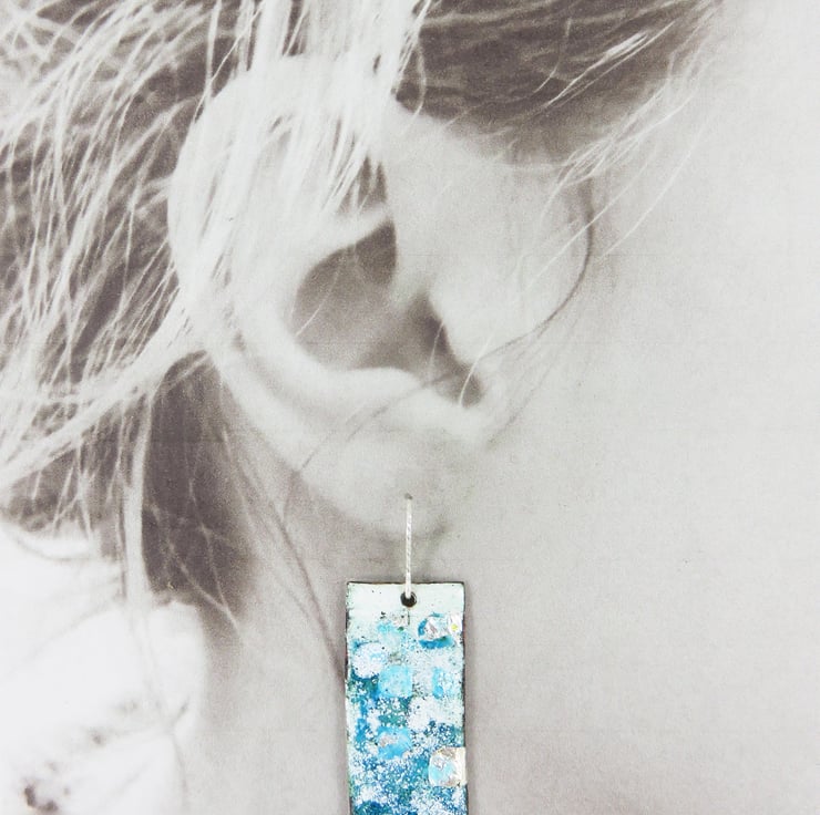 15mm x 40mm copper rectangles have been textured on the back with a punch tool. On the front layers of white and transparent turquoise enamel have been fired onto the copper surface. Squares of silver foil have been melted into the laid onto the surface and more enamels applied. Twisted silver wires have been attached for a glittery effect. A unique one off pair of statement earrings.
