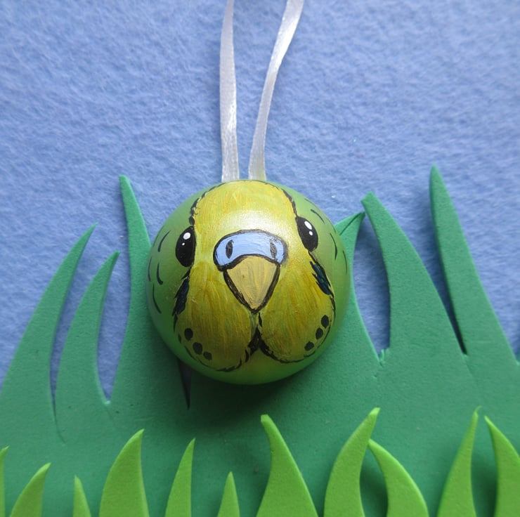 The budgie is painted in acrylic paints with felt backing on the flat side of the wooden ball.