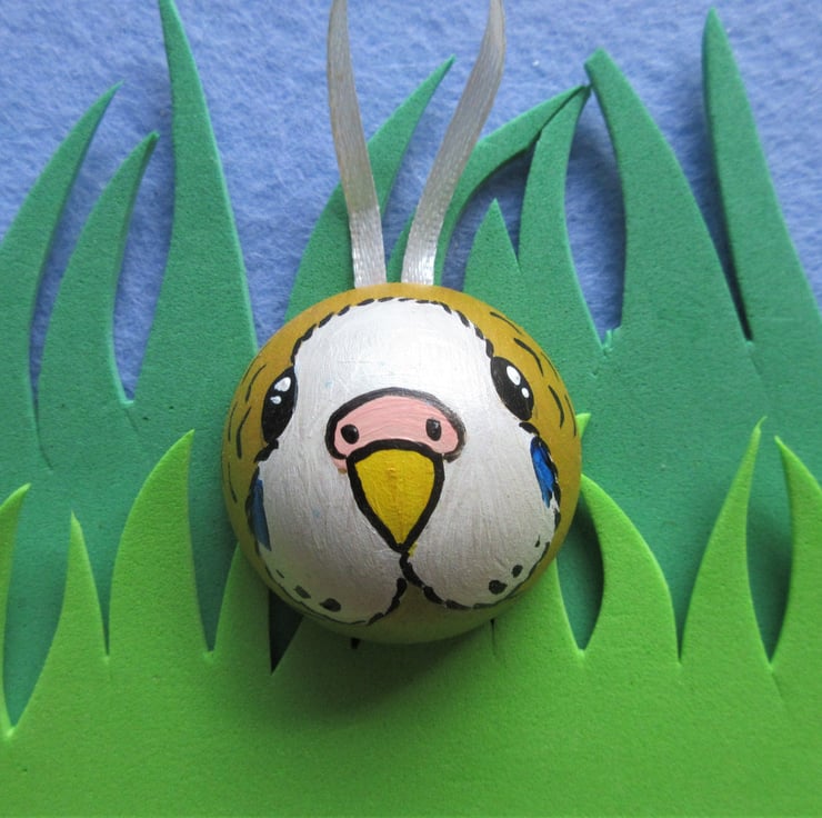 The budgie is painted in acrylic paints with felt backing on the flat side of the wooden ball.