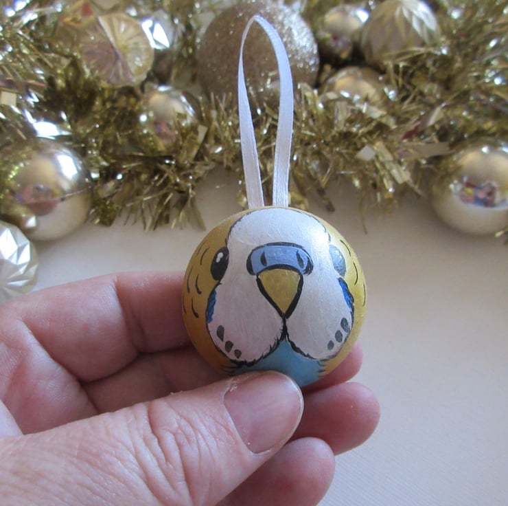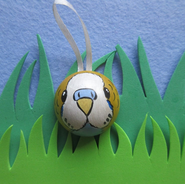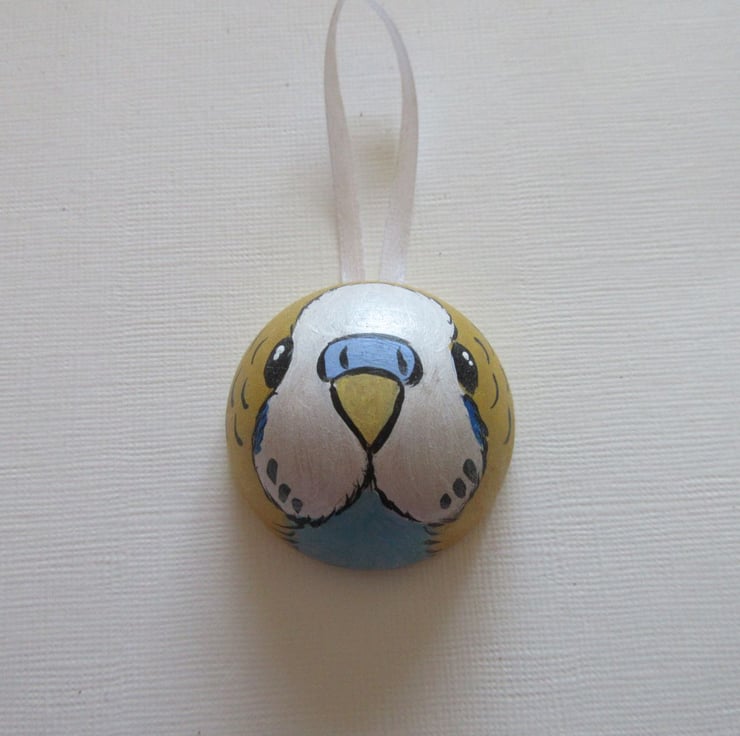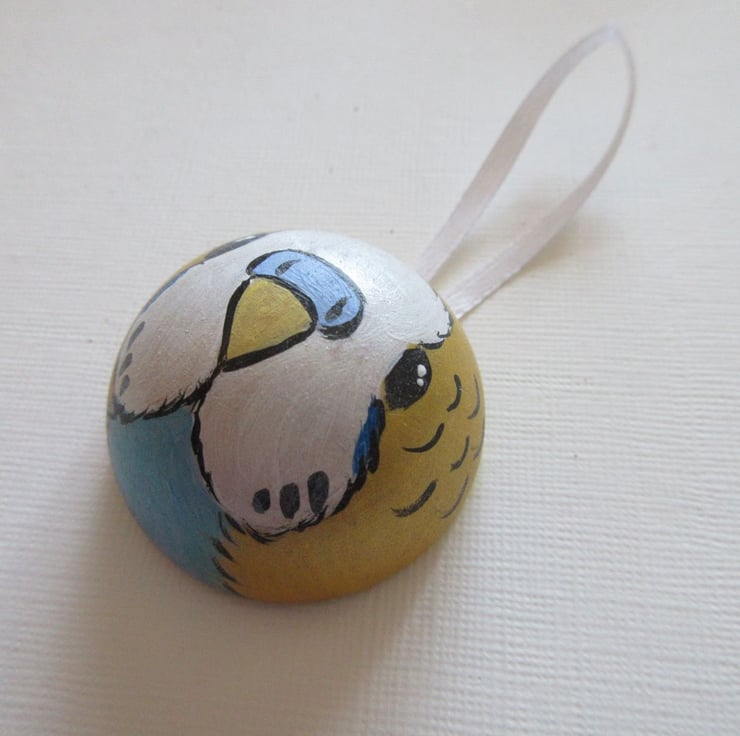 The budgie is painted in acrylic paints with felt backing on the flat side of the wooden ball.
