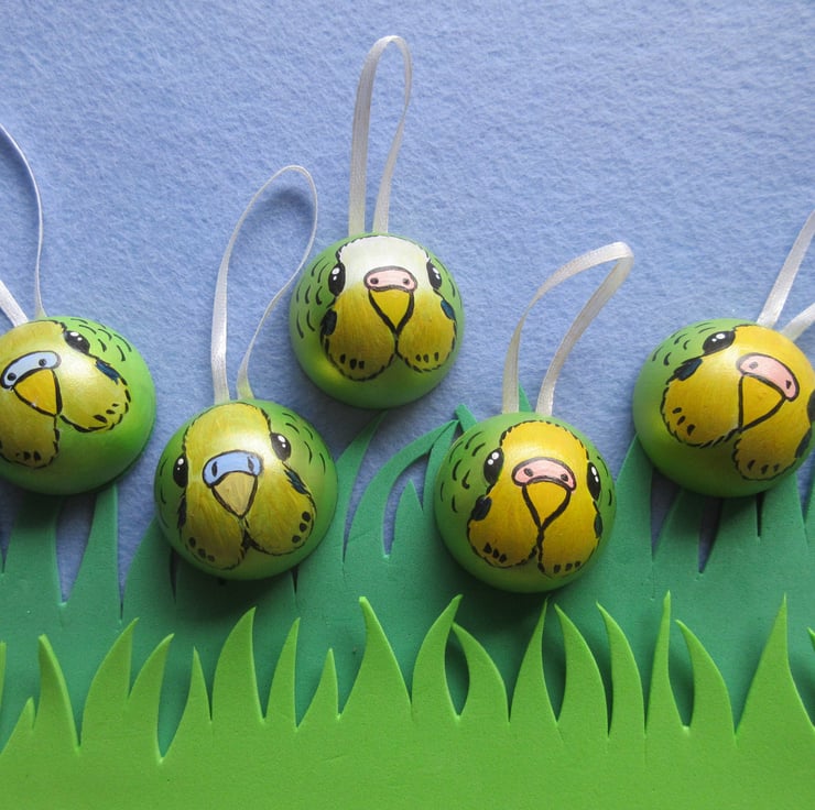 The baubles are 4cm / 40mm diameter, and are flat on the back. Each budgie has a length of ribbon attached to hang it by.