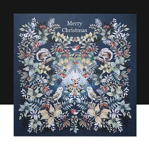 A Blue-grey background brings this woodland scene to life. A beautiful festive collection of woodland leaves and berries surround this glimpse of wildlife. Robins, squirrels, owls and a centre stag live in this imaginative winter wonderland. All hand-painted they come to life in this design produced in Photoshop.