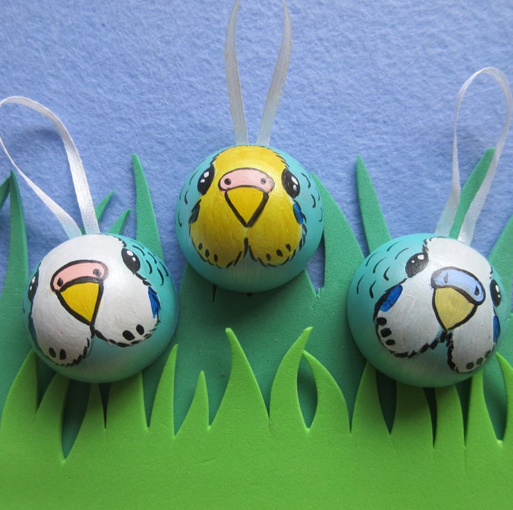 The baubles are 4cm / 40mm diameter, and are flat on the back. Each budgie has a length of ribbon attached to hang it by.