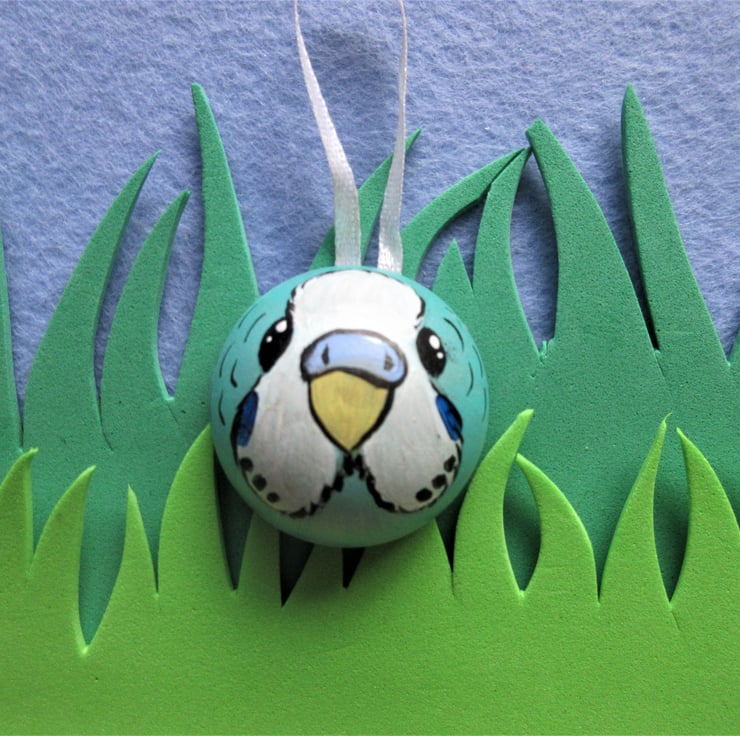 The budgie is painted in acrylic paints with felt backing on the flat side of the wooden ball.