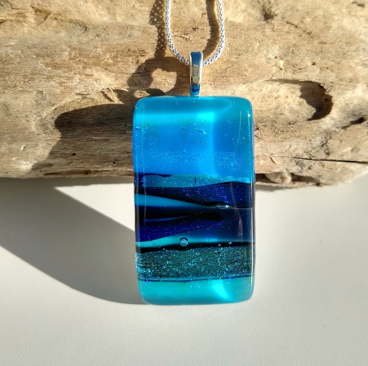 This beautiful layered pendant in shades of blue and turquoise fused glass is inspired by Cornish coastal scenery. With tremendous depth it gives the impression of looking out over the sea with its varied hues. The dichroic glass accents incorporated into the design sparkle and shimmer in the light.