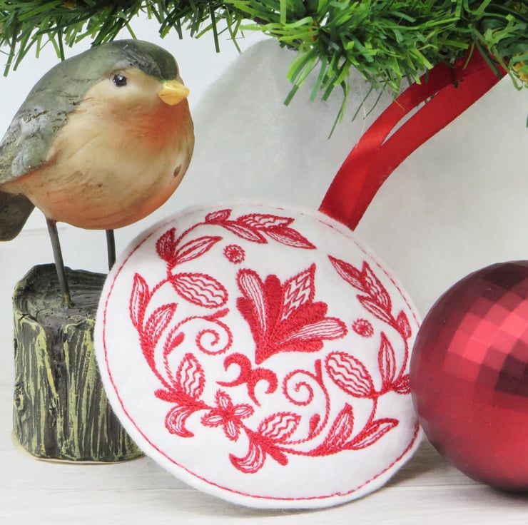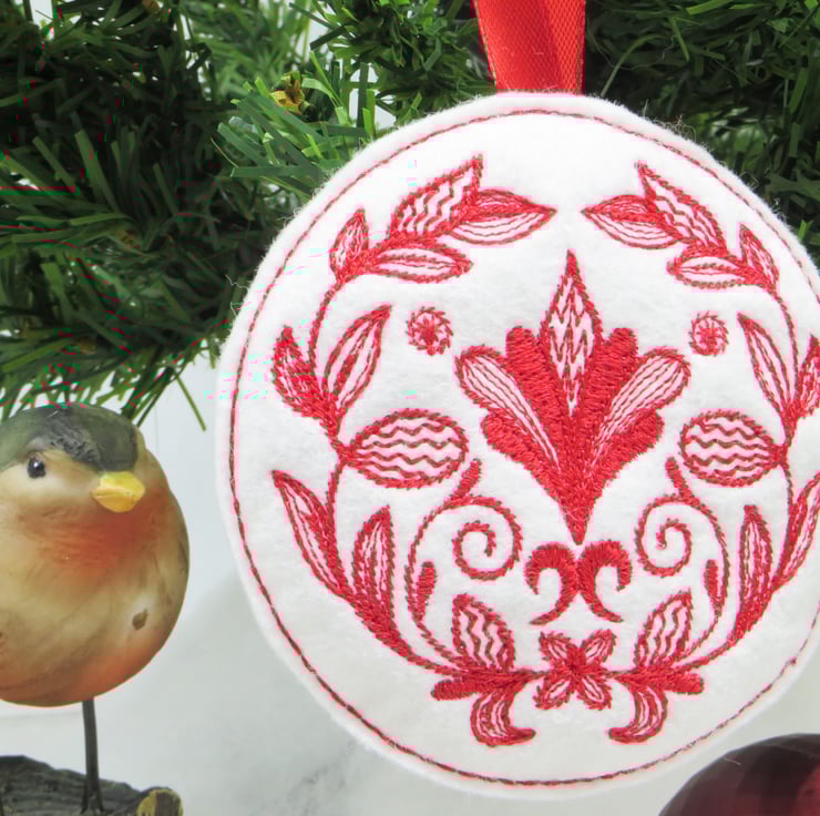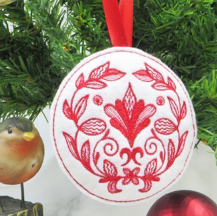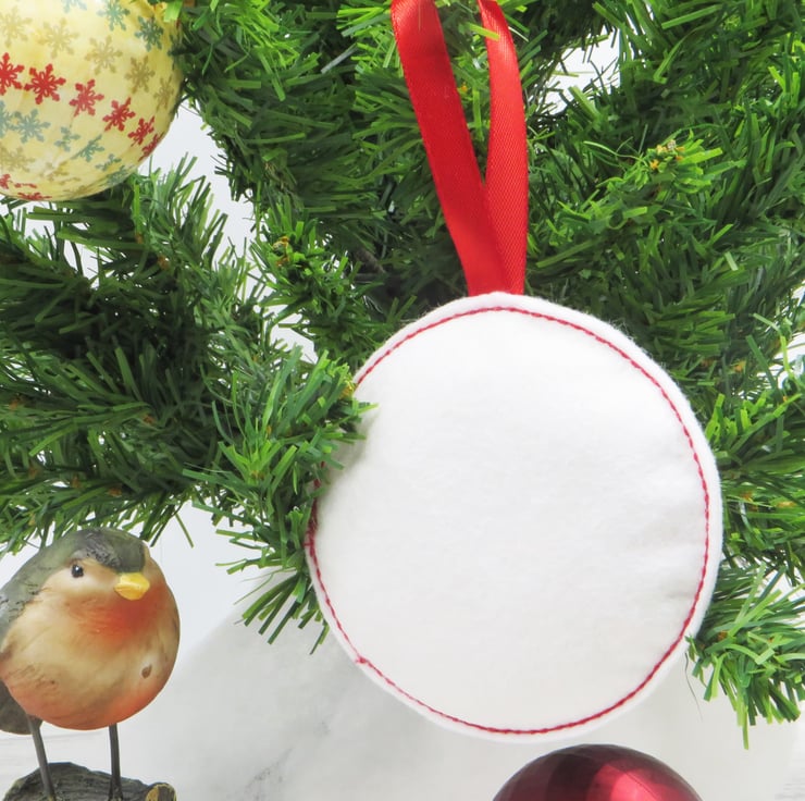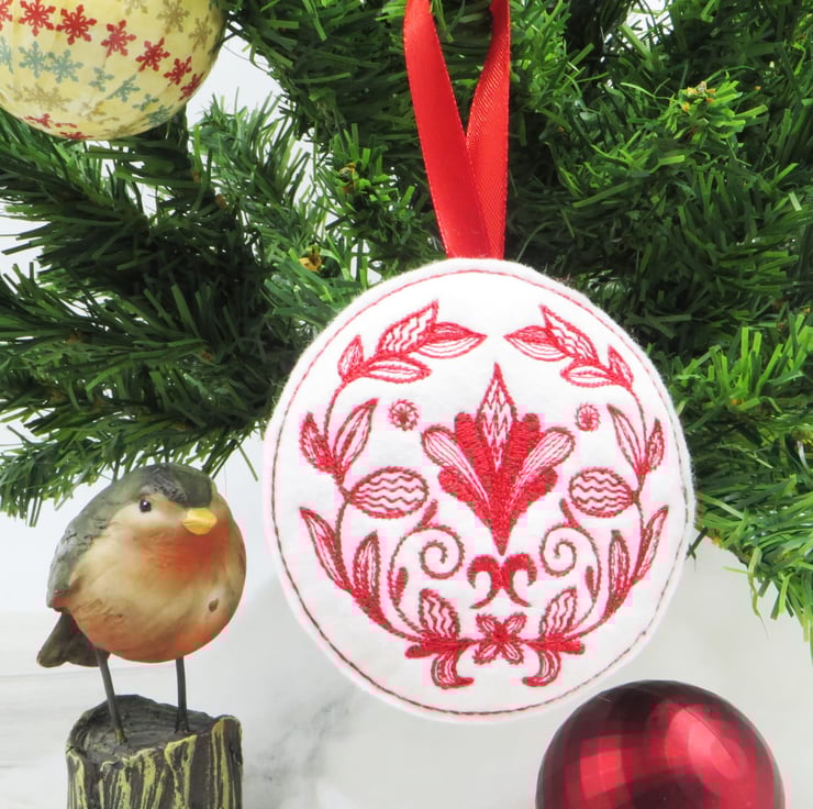 The decoration is made from white circle shaped felt and has a beautiful nordic folk art style design machine embroidered on the front. All my ornaments can be personalised with any name of your choice on the back which can also be left blank. It is softly padded and finished with a bean (triple) stitch around the edge. Each decoration is approx. 3 1/2" in height and has a pretty red ribbon loop with which you can hang it anywhere around your home.