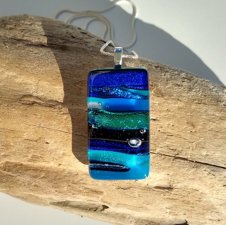 This beautiful layered pendant in shades of blue, turquoise and aqua fused glass is inspired by Cornish coastal scenery. With tremendous depth it gives the impression of looking out across the swirling sea. The dichroic glass accents incorporated into the design sparkle and shimmer in the light.