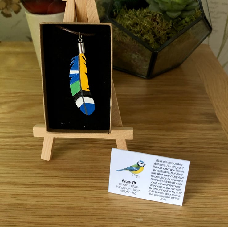 A unique hand-painted wooden pendant with a varnished finish inspired by the plumage of a blue tit.