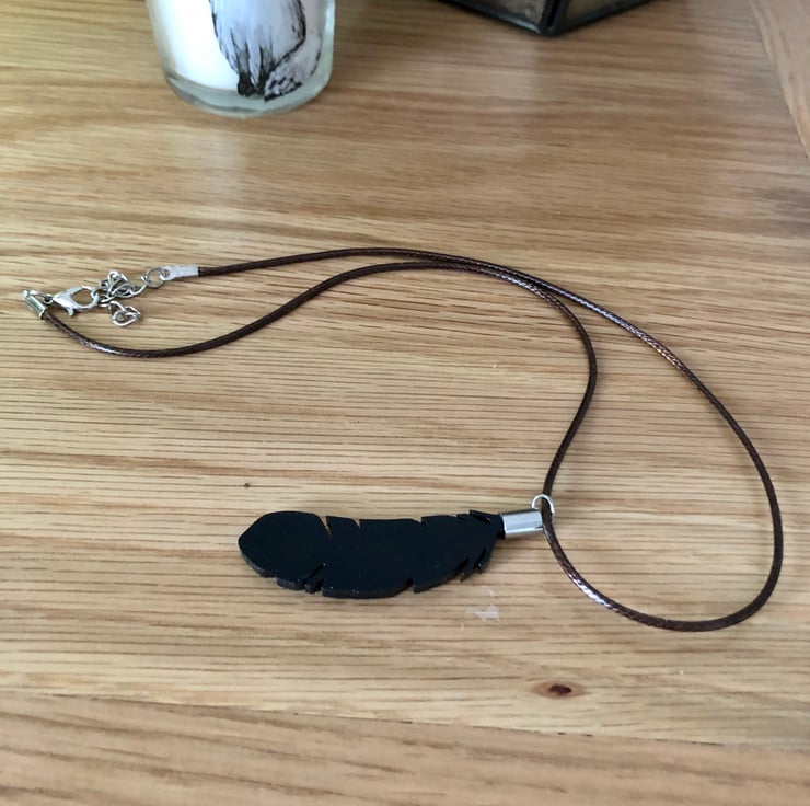 Made from a 50mm MDF feather craft shape and a stainless steel end cap attached to a 20” brown leather wax cord.