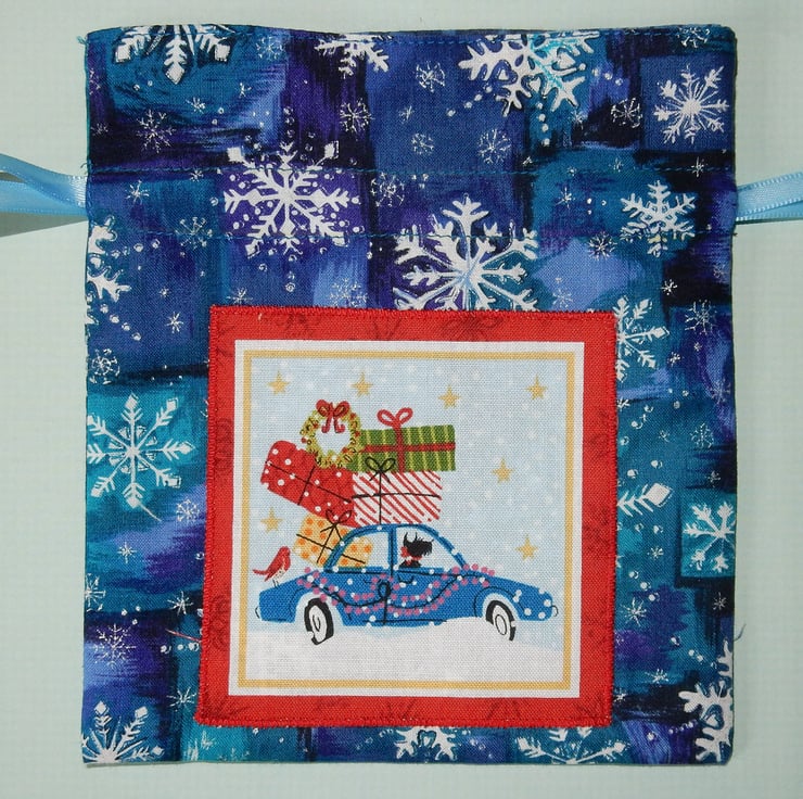 This drawstring bag is just the thing for that special gift. It will add a touch of luxury, and it measures 6.5 x 5.5 inches, and is fully lined. There is a drawstring closure with satin ribbon, which can be used to hang it from a Christmas tree. There is a picture panel showing a car loaded with presents appliqued on the front.