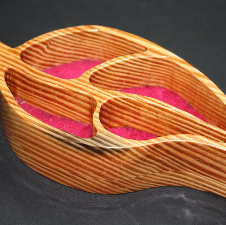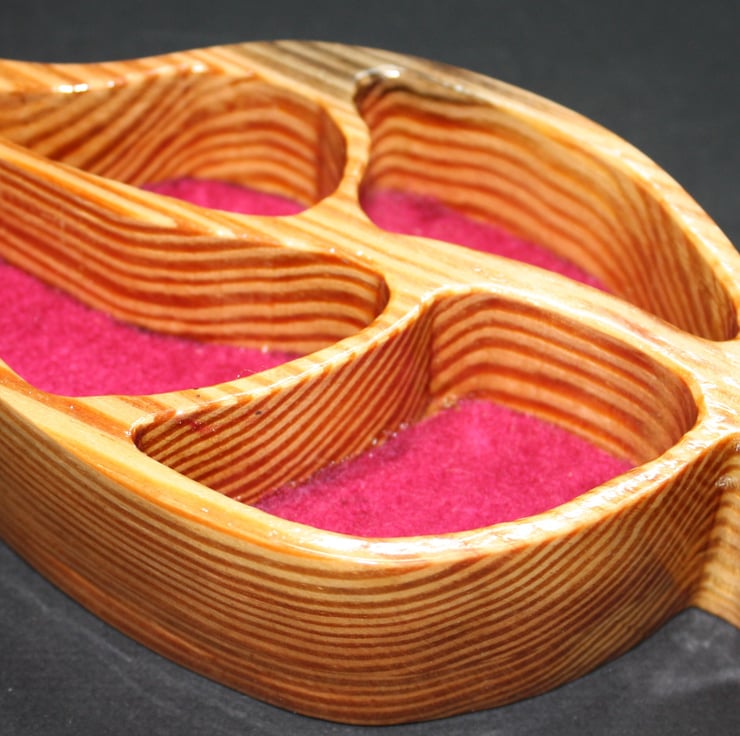 Recycled wood was cleaned and sanded to enable me to upcycle it. The design was applied to two pieces of wood and cut using a Scroll Saw. The first piece (the top) was cut with the openings, whilst the second piece was cut solid to form the base. The base was glued to the top piece. The ornament was lightly sanded all around to give it a slight round over effect. Felt was then glued to the inside of the dish. It was coated with lacquer to protect and enhance the grain. The lacquer is heat and water resistant.