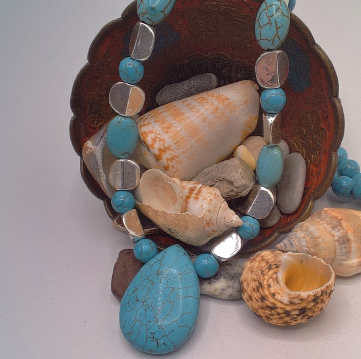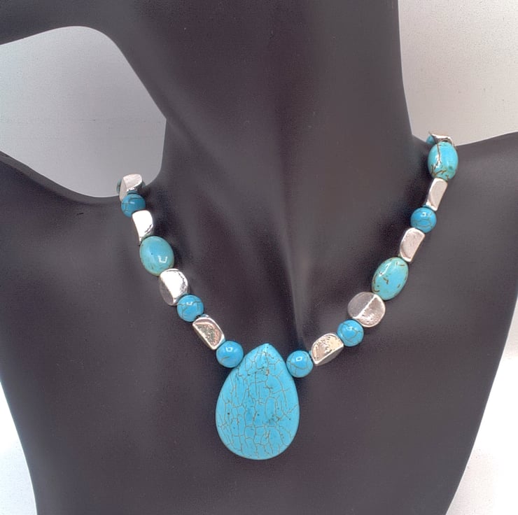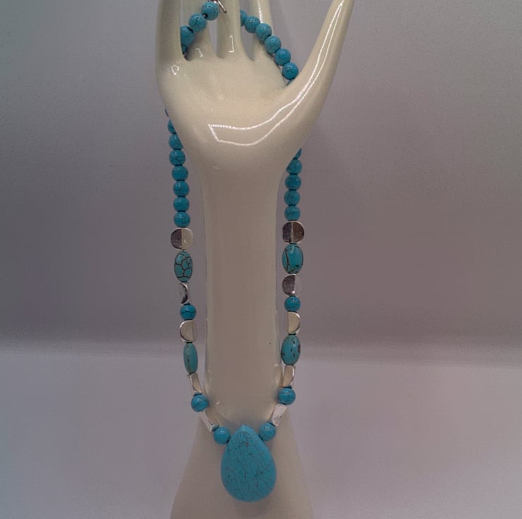 The necklace is made using a 35 x 25 mm teardrop turquoise pendant with 15 x 10 mm oval turquoise beads, 8 mm round turquoise beads and 10mm x 10mm shaped silver plated beads, secured with a silver plated toggle clasp. It is 19 inches (48cm) in length.