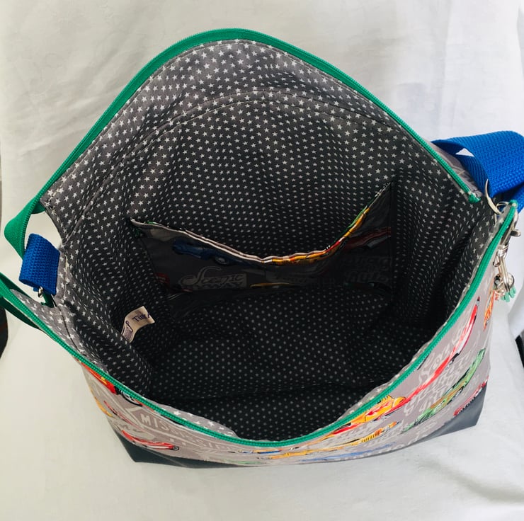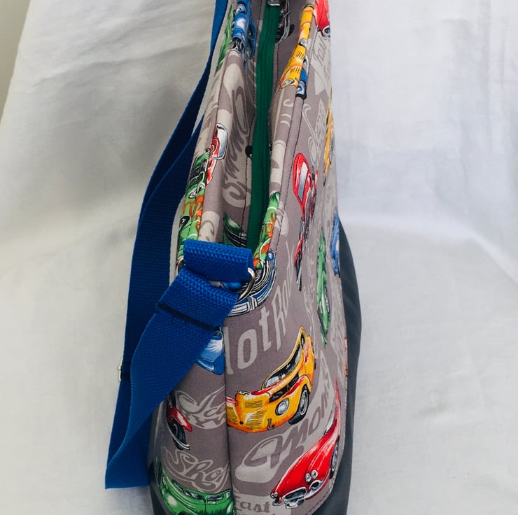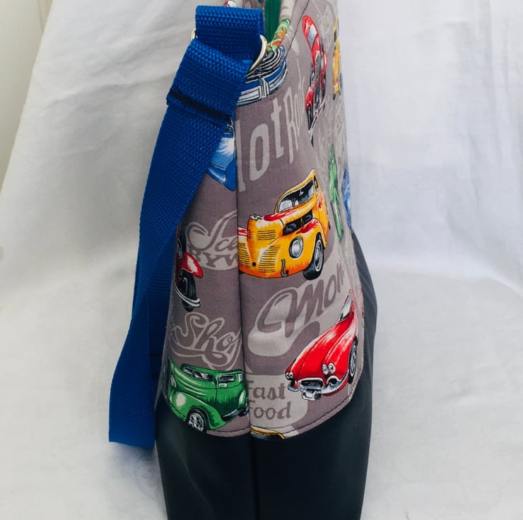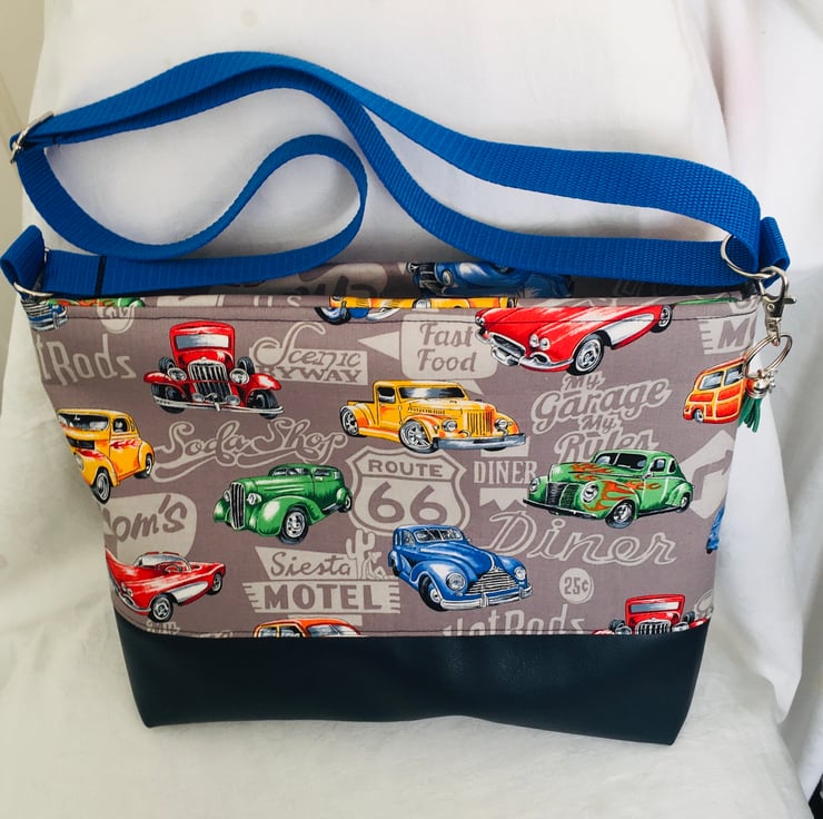 This is a simple yet stunning style bag. This bag can easily be worn crossbody or over the shoulder, due to its fully adjustable strap. A bag with plenty of room for all your essentials, with a zip closure along the top of the bag. The bag has been made using dense weave cotton for the top with Classic American cars print and backed with stabilizer to keep it's form. The base of the bag is faux leather, giving strength and stability. The handle is a strong nylon webbing and fully adjustable. Finished with a zip pull charm and clip charm for embellishment on outside of the bag.