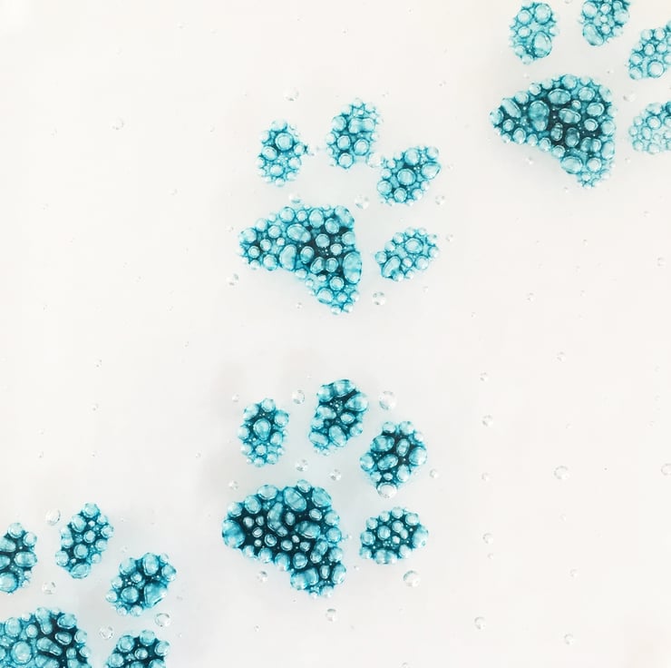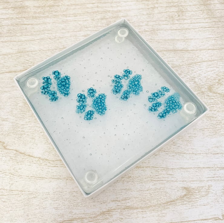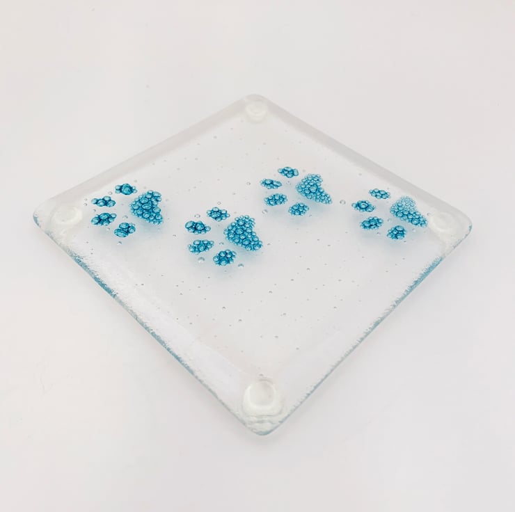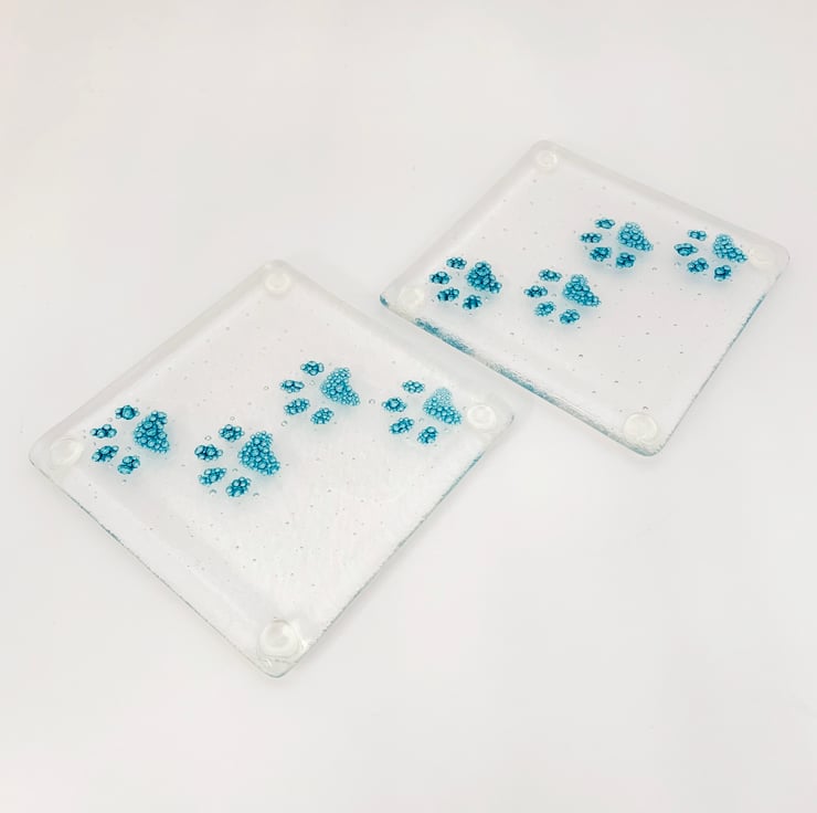 Fused glass handmade bubbly pawprint coasters. These are a set of 2 coasters which come in a gift box, perfect as a gift for any animal lover. Transparent glass with hand painted turquoise bubble pawprints running diagonally across the coaster. I use rubber feet on the underside of all my coasters to provide a non-slip and non-scratch base.