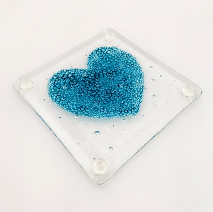 Fused glass handmade bubbly heart coasters. These are a set of 2 coasters which come in a gift box, perfect as a gift for a loved one or friend. Transparent glass with hand painted turquoise bubble hearts in the centre of the coaster. I use rubber feet on the underside of all my coasters to provide a non-slip and non-scratch base.