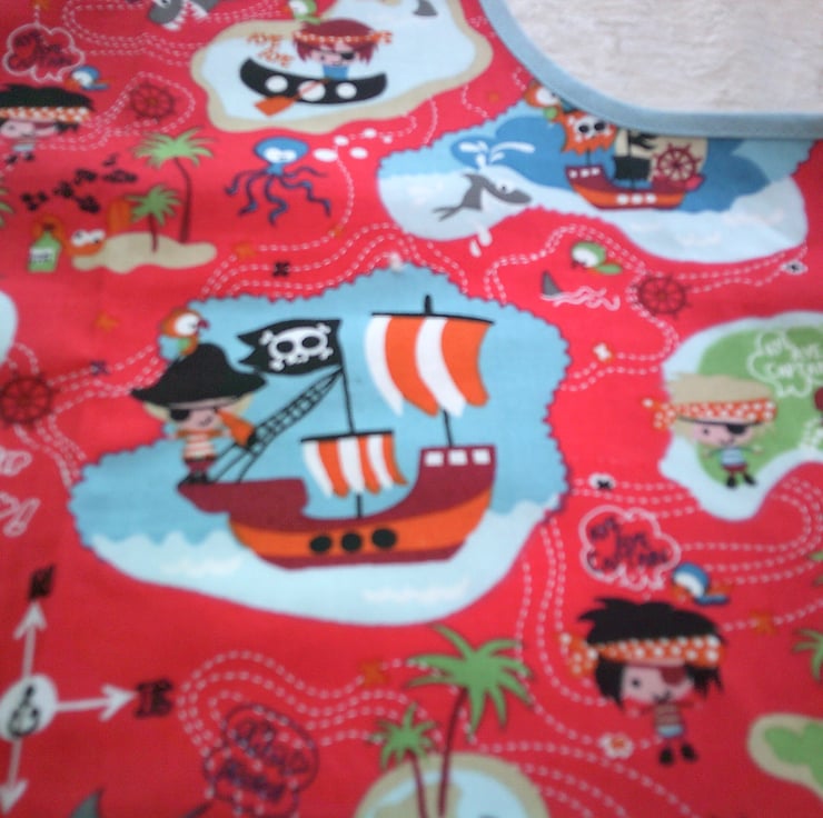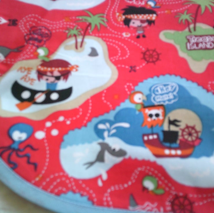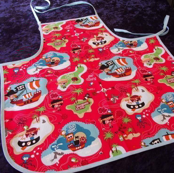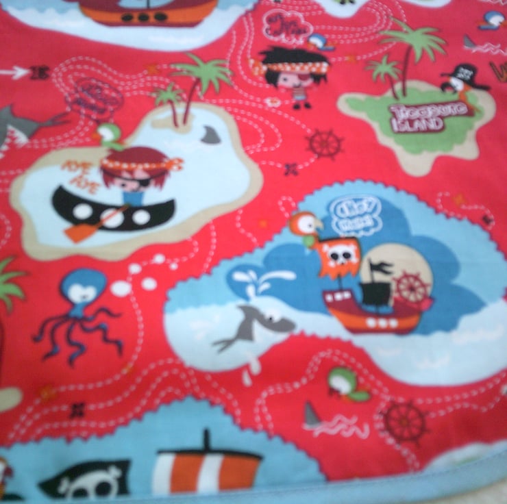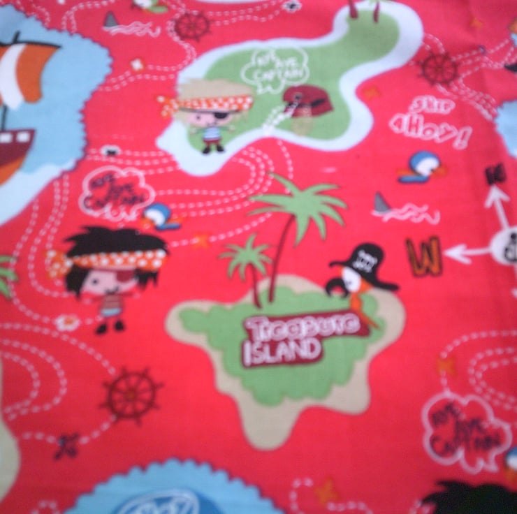 The design features Pirates on Treasure Island and on their Boats at sea hunting for treasure on a Red Background and edged with blue bias binding.