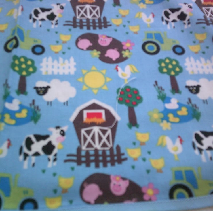 The design features a Farmyard scene with barns, cows, sheep, pigs and chickens and chicks on a blue background. This colourful apron is edged with blue bias binding.
