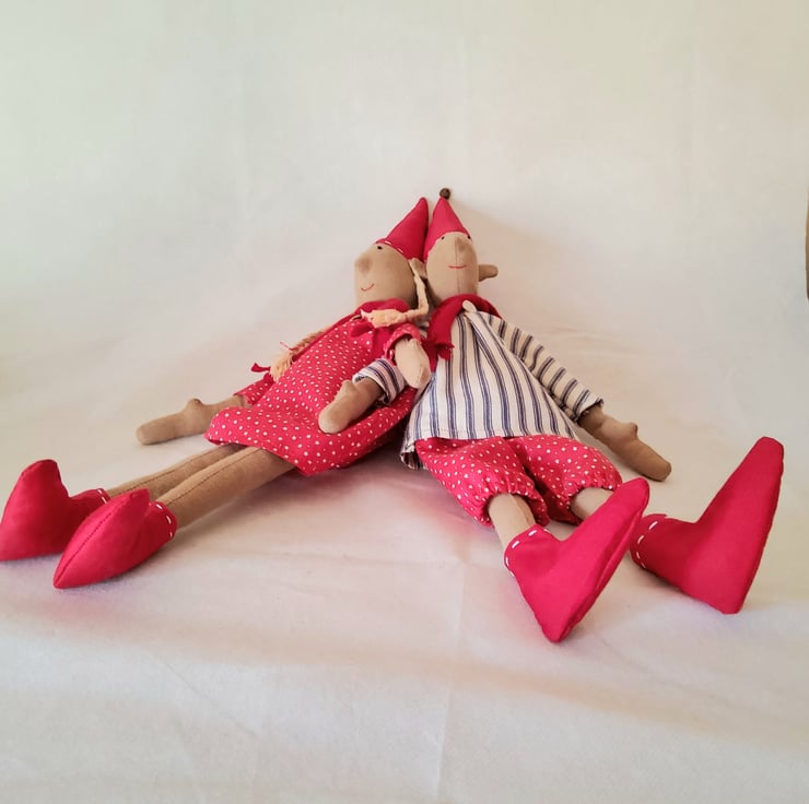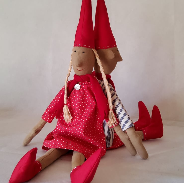 This is Girlie Elf - made from coffee and cinnamon dyed Osnaburg fabric which has then been given a quick sand. She has embroidered features ,flushed cheeks (that must be from helping Santa ) and has linen yarn plaited hair.Her pointy cotton hat is trimmed with a rusty bell and it does tinkle ! Her dress is cotton poplin that has hand stitched edges and is finished at the neck with a mother of pearl button and her boots have had the same treatment. .Opps nearly forgot - she has a red wool scarf around her neck .