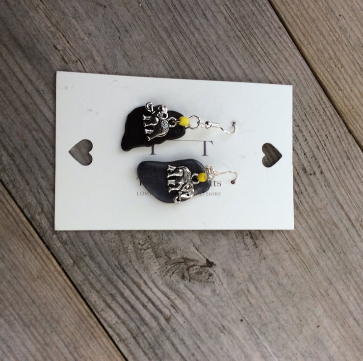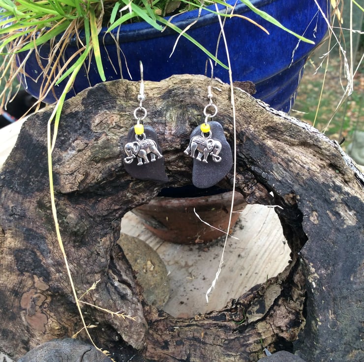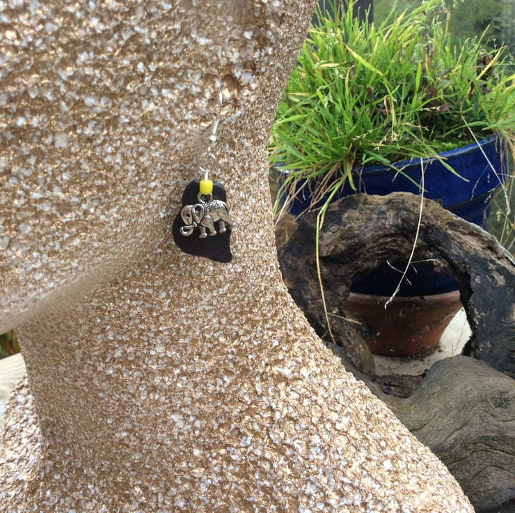 Natural sea washed slate embellished with silver coloured elephant charms, topped with a pop of yellow bead. These earrings are so versatile and who doesn’t love an elephant?