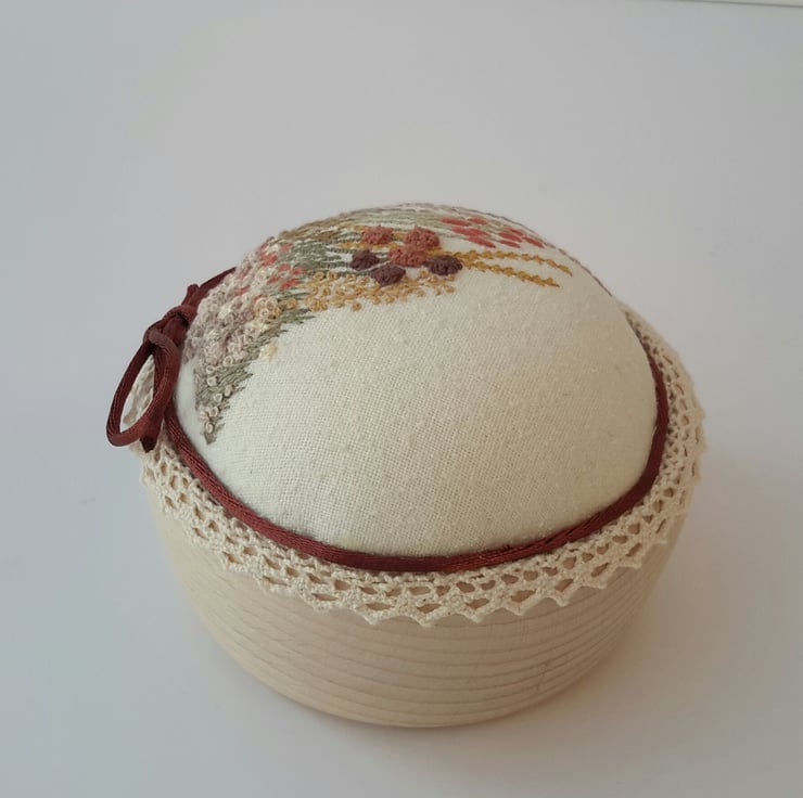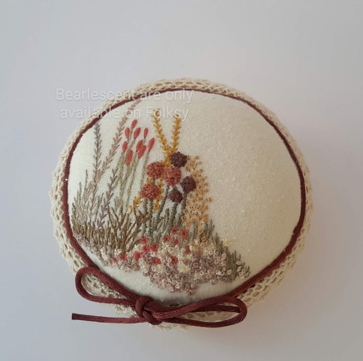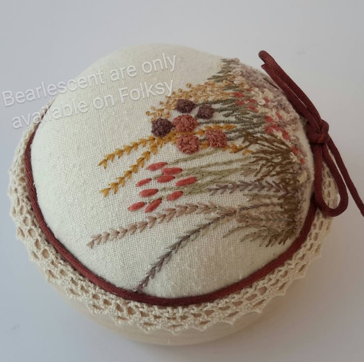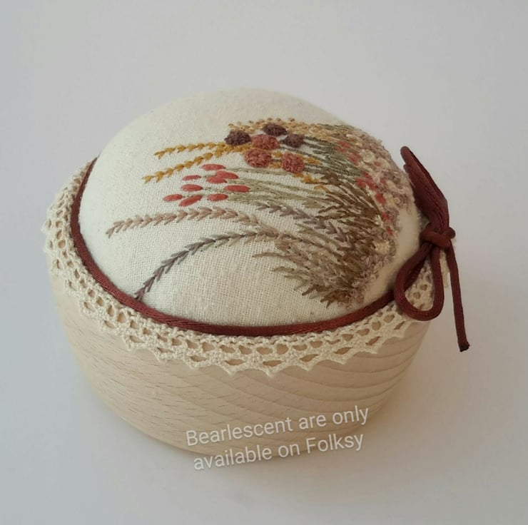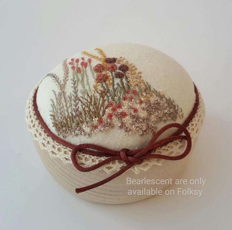 This is a beautiful hand embroidered, unique pin cushion, a hand sewn gift designed by Bearlescent.