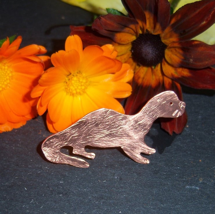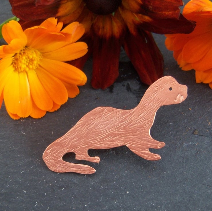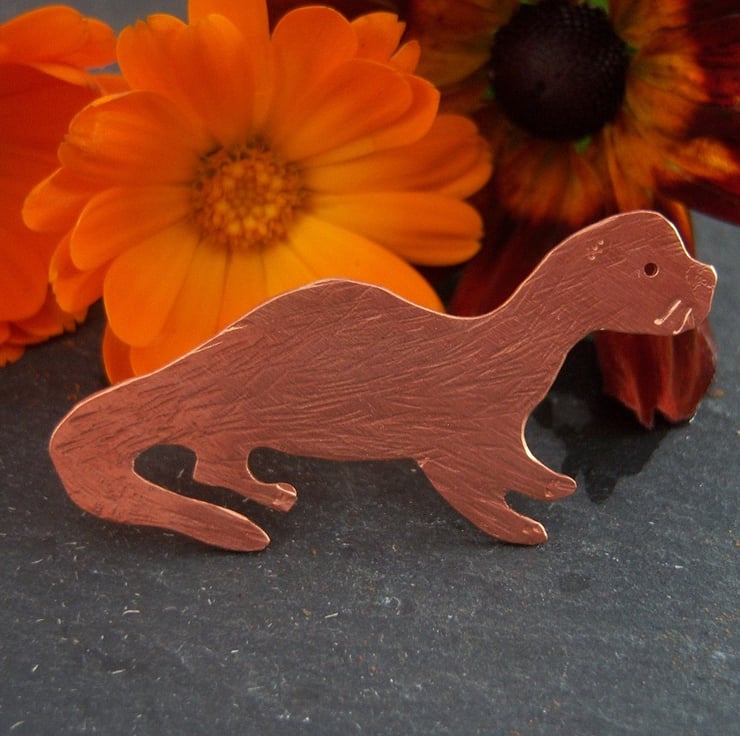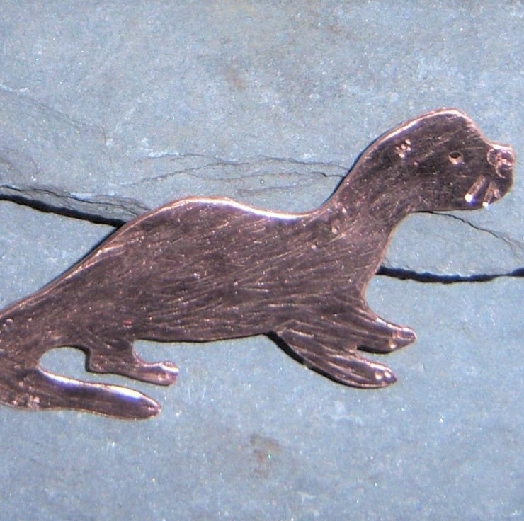 An otter cut from copper sheet and textured. The fastener is sterling silver. Approximately 5cms long.