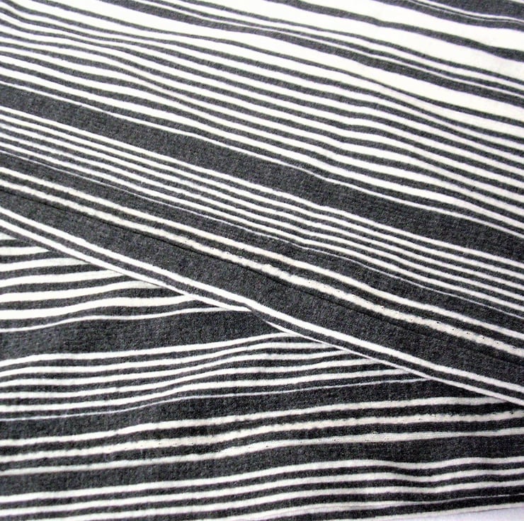 A light/medium weight, double thickness, soft viscose and polyester jersey scarf with mid grey and cream vertical stripes with white, grey and cream pom pom fringe. Number 132B
