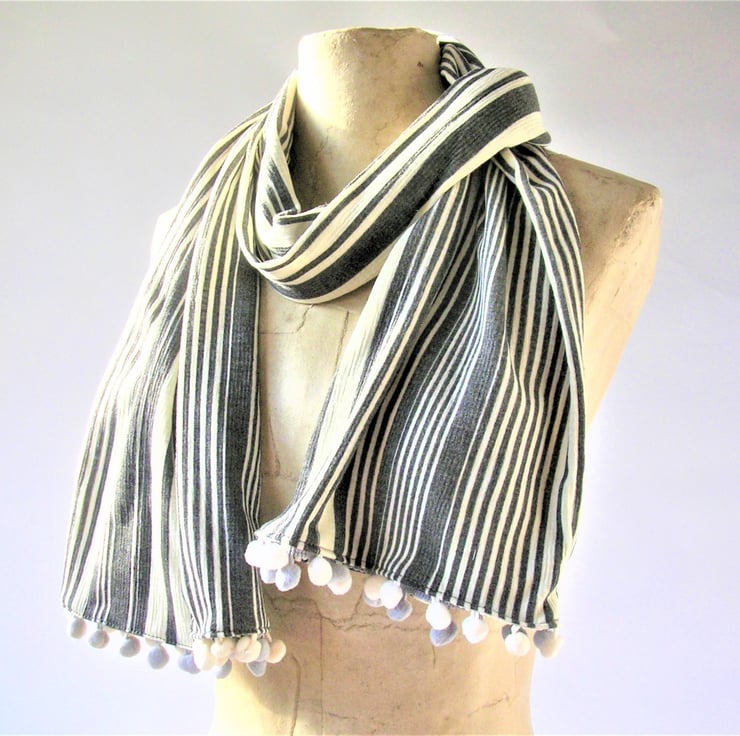 Grey and Cream striped viscose jersey light weight informal Scarf pom pom fringe