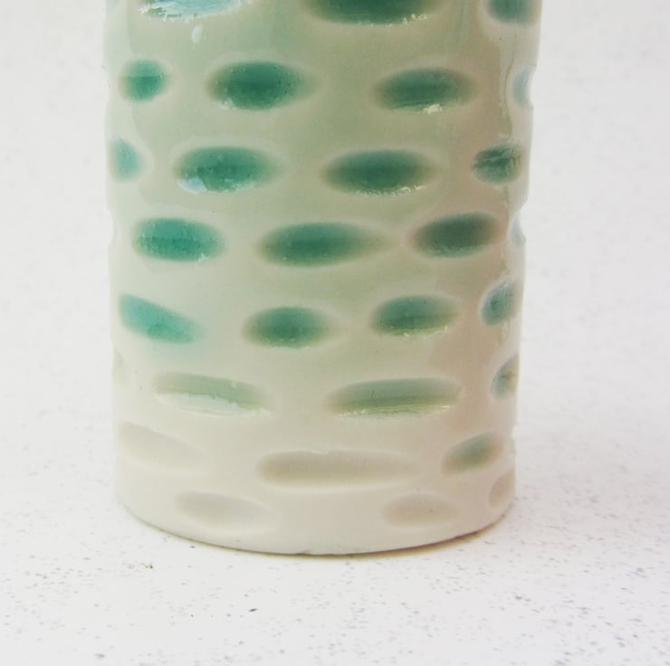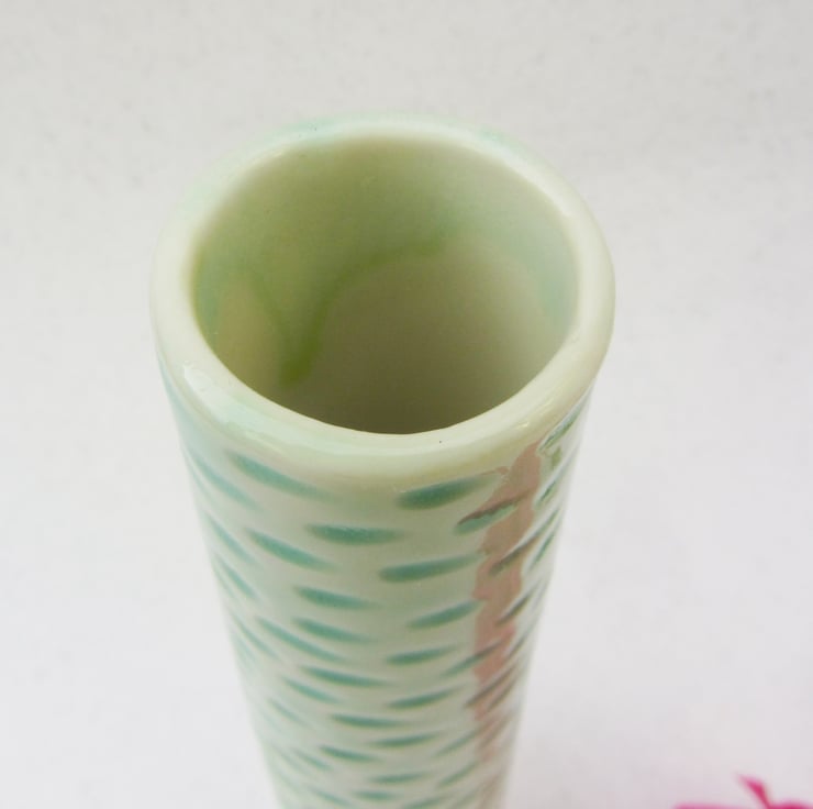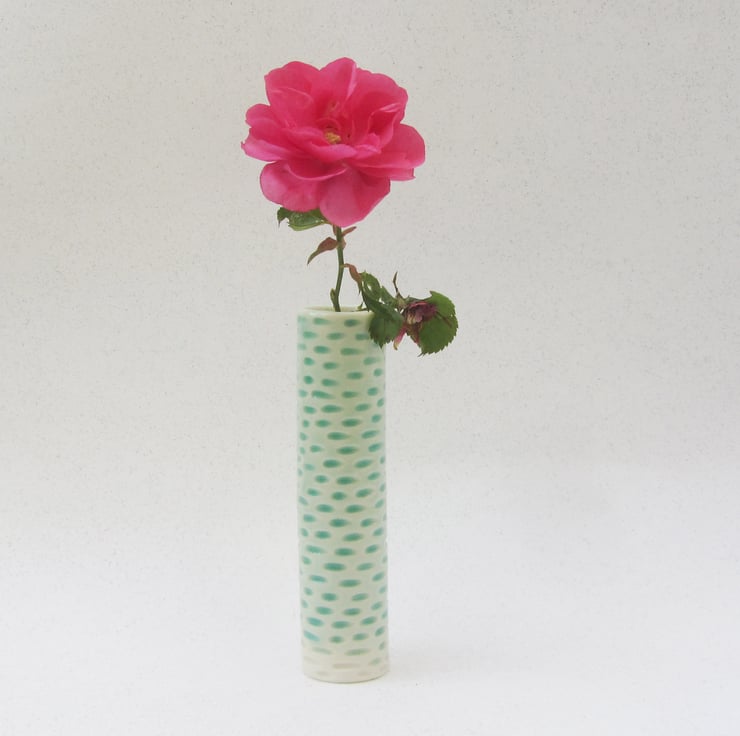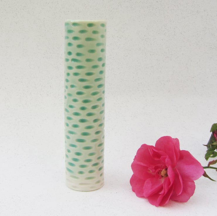 Porcelain bud vase that is 13cm high and 3cm in diameter.