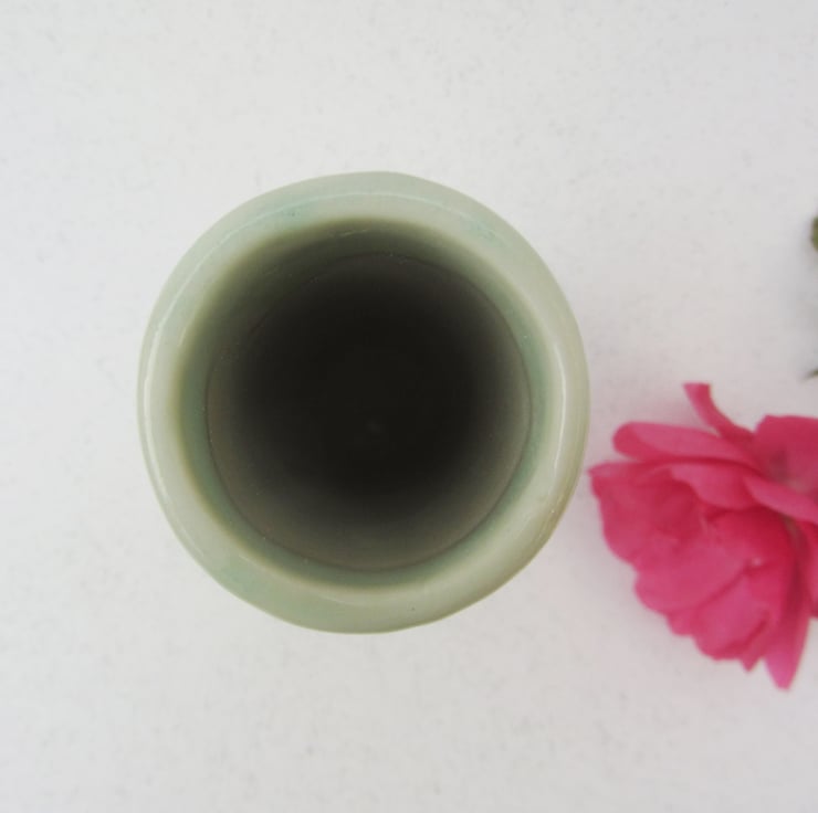 The carvings on this vase can either be seen as fish swimming around, or as the markings ou would see on the trunk of a silver birch. Its glazed inside so it is easier to clean.