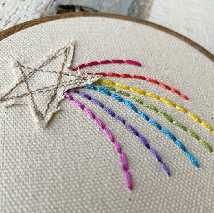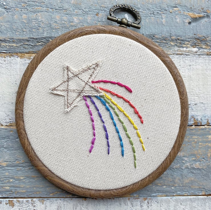 A cute 4” hand embroidered design with rustic appliqué star.