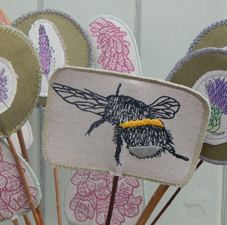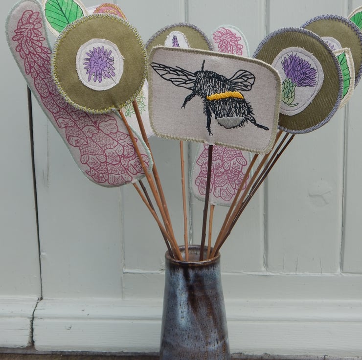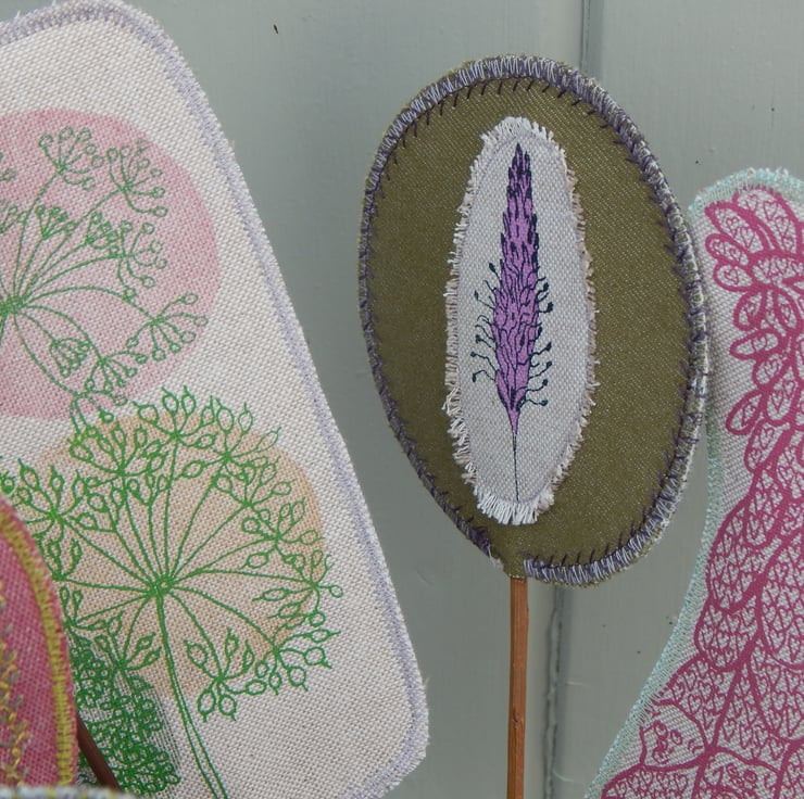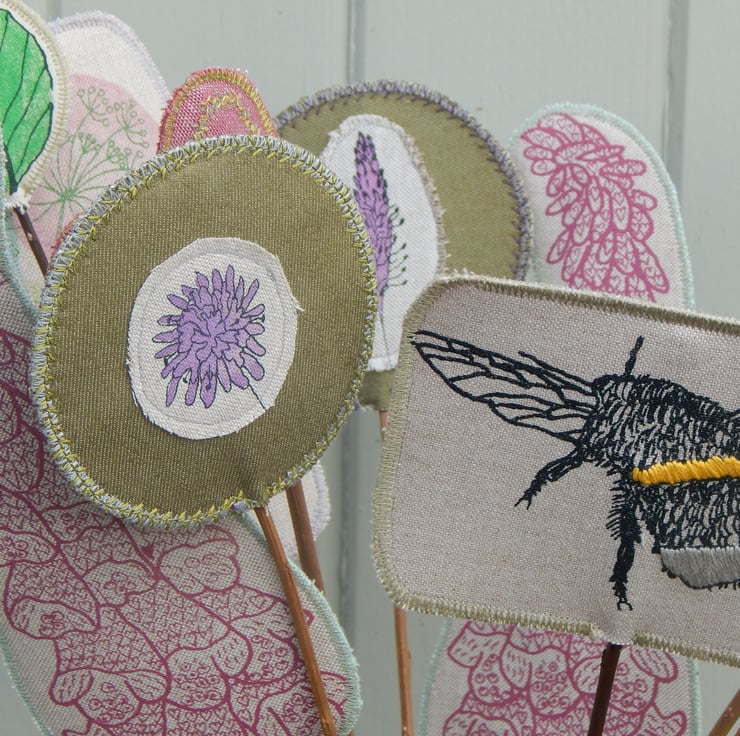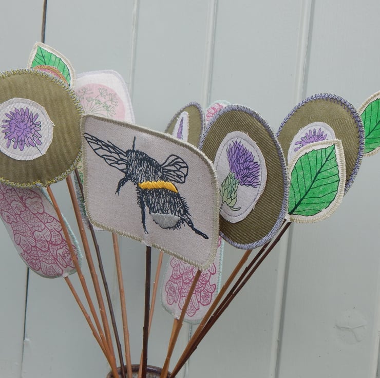 There is 1 bee that has been screen printed on both sides and hand embroidered on one side with his yellow and grey bands. There are 2 foxgloves, 2 green beech leaves, 2 scabious, 1 plantain and 1 thistle. There is a panel of cow parsley screen printed onto simple round lino prints. There is a pink heart with green machine embroidery.