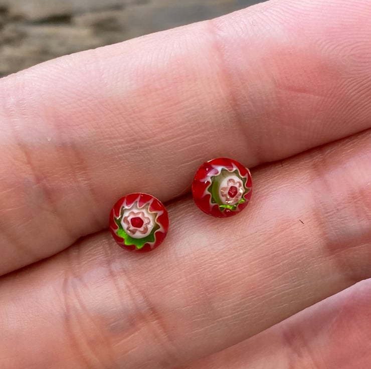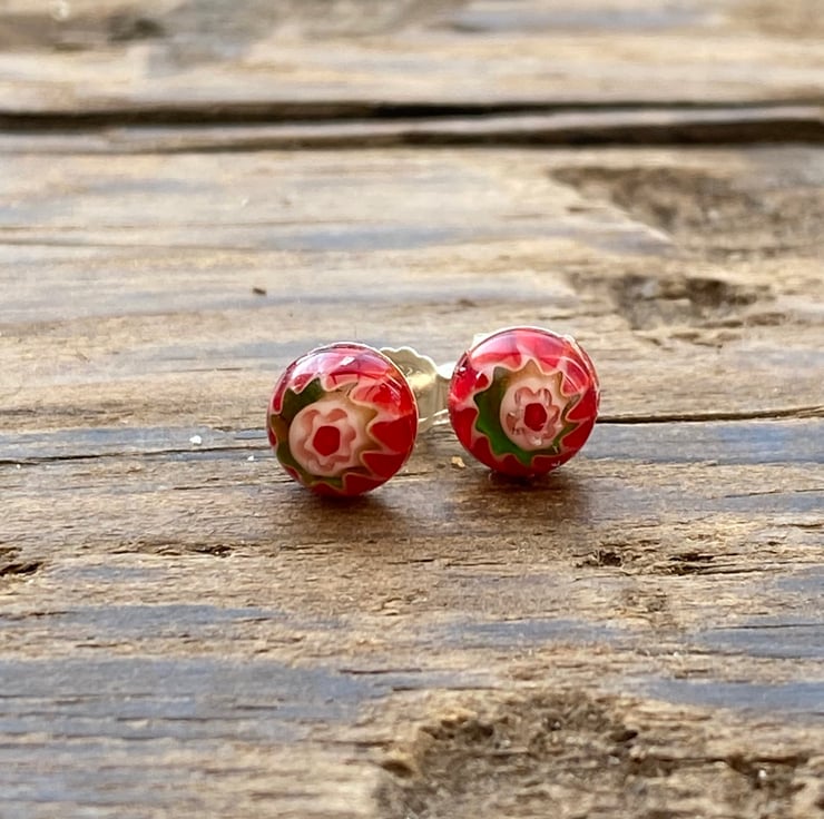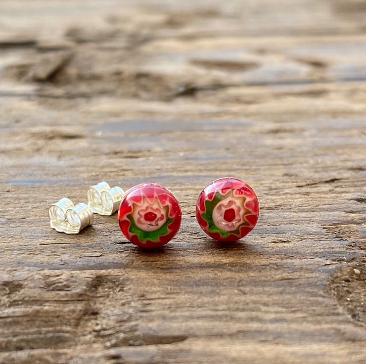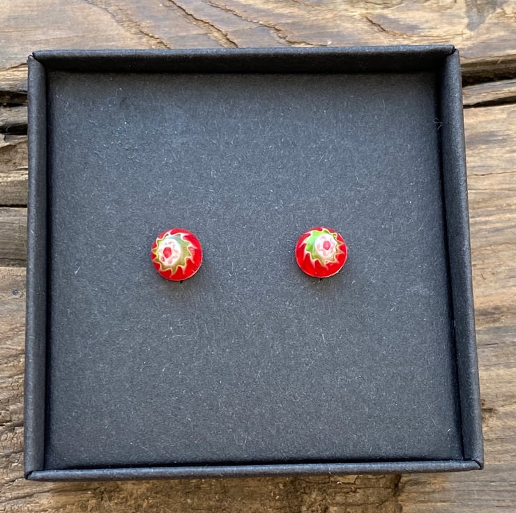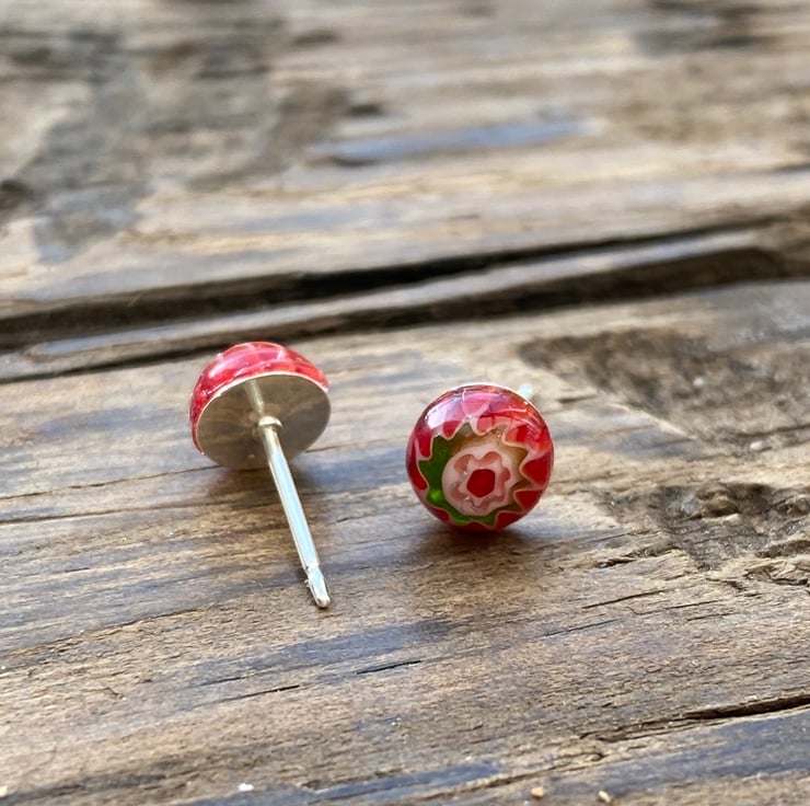 6mm red millefiori glass cabochon on 6mm sterling silver post stud earrings. Fastened with sterling silver scroll backs.