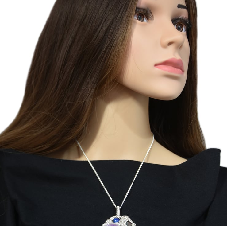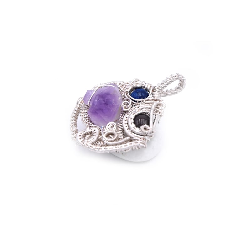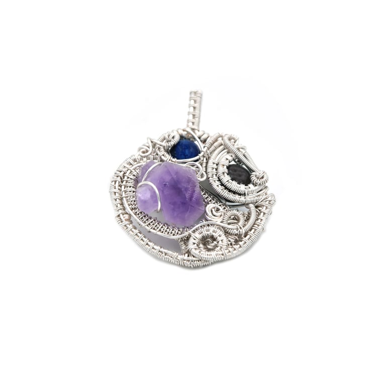 The main stone is a recycled raw amethist piece; with the side beads in deep blue lapis lazuli and a rotating labradorite.