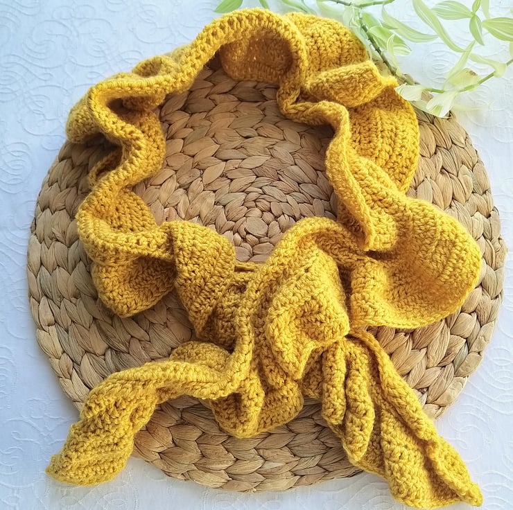 In a luxurious soft merino blend yarn this Gold/Mustard scarf has a frilled edging and is perfect wearing with a coat or jacket or just to brighten up a top.