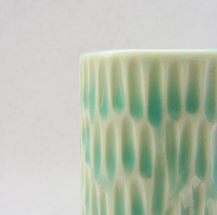These carvings are inspired by flower seeds, and the aquamarine coloured glaze is deeper in colour in the carvings. Its glazed on the inside to make it easier to keep it clean.