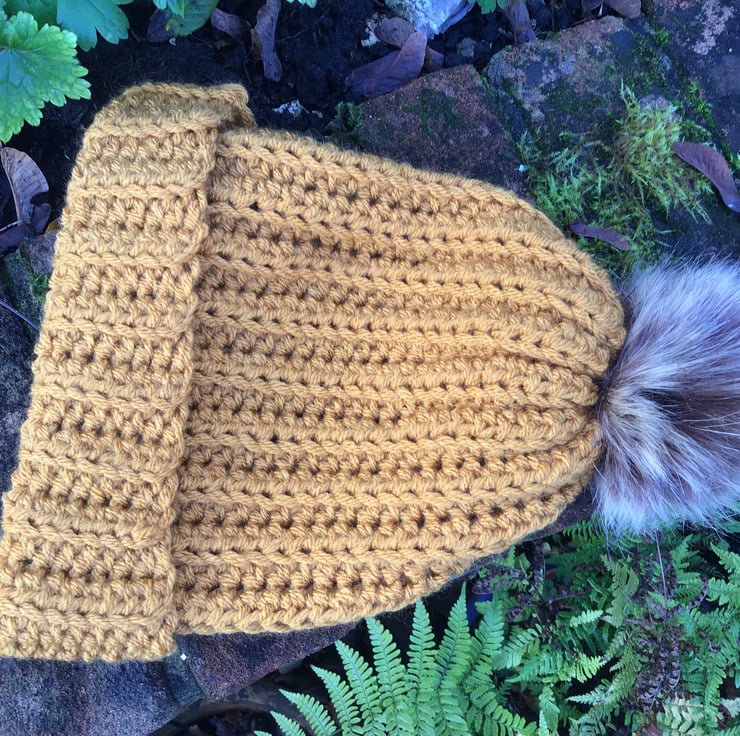 This hat is made with a soft premium acrylic wool (no itching) in colour Gold.(please note the colour may vary slightly on your screen)