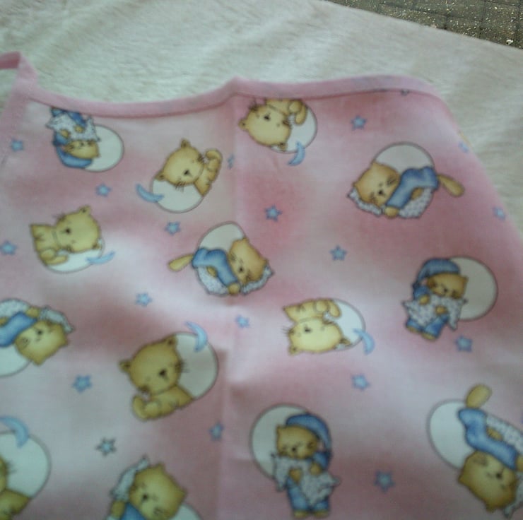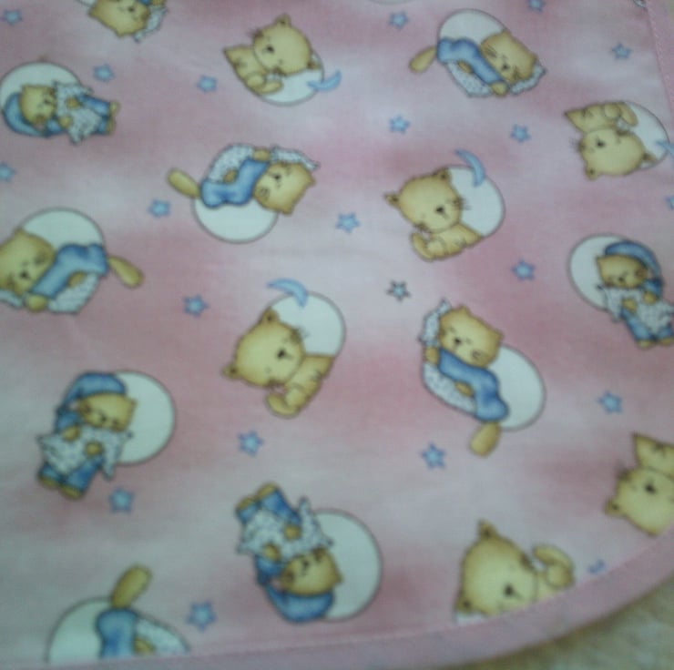 The design features sleepy cats in blue pyjamas with their pillows on a pink background and a pink bias binding edging.